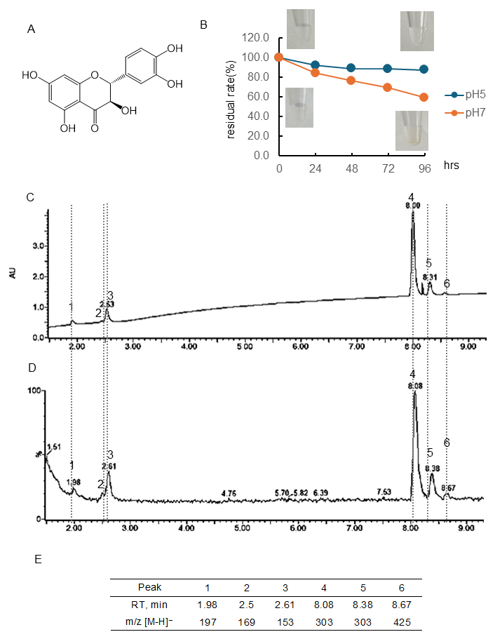 - Stenger Moura, F.C.; Dos Santos Machado, C.L.; Reisdorfer Paula, F.; Garcia Couto, A.; Ricci, M.; Cechinel-Filho, V.; Bonomini, T.J.; Sandjo, L.P.; Bellé Bresolin, T.M. Taxifolin stability: In silico prediction and in vitro degradation with HPLC-UV/UPLC-ESI-MS monitoring. J. Pharm. Anal. 2021, 11, 232–240. [Google Scholar] [CrossRef]