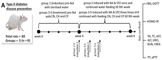 Initially, the Institutional Animal Care and Use Committee (IACUC) of Fu Jen University (New Taipei City, Taiwan) approved all the animal experiments, which followed the standard experimental animal operation procedures. Overall, 30 male Wistar rats (6-week-old, 250 g) for the T2D study and 40 male Sprague-Dawley rats (6-week-old, 250 g) for the PDstudy were purchased from BioLASCO Co. Ltd. (Taipei, Taiwan). After transportation to the Fu Jen University Animal Center, all these rats were housed in individual ventilation cages with the relative humidity at 55 ± 10%, the temperature at 21 ± 2 °C and the day/light cycle for 12 h. Prior to the animal experiment, a permission document (approval number A11318) for performing T2D and PD issued by Fu Jen University Animal Care and Use Committee was obtained, with the experimental steps following approved guidelines. All rats were fed with standard rodent chow diet (LabDiet Co., St Louis, MO, USA) and water ad libitum during the experiment, with the water, food intake and body weight being recorded over a period of 9 weeks. Also, environmental conditions including lighting, humidity, temperature, noise and air quality levels were standardized in all cages during the entire experiment, and environmental enrichment in the form of wooden sticks and bedding materials was provided to have natural behavior and reduce stress.