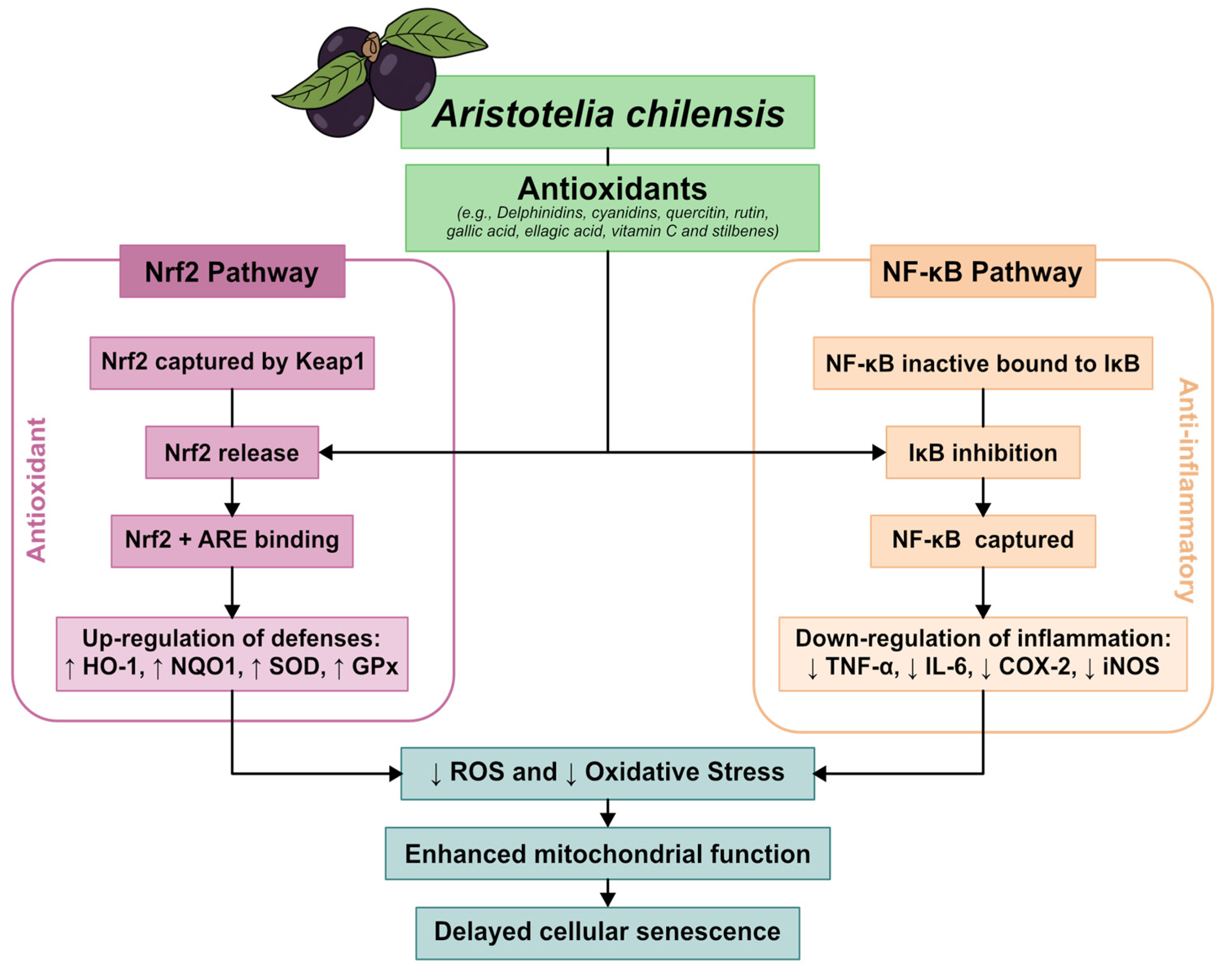 At the molecular level, maqui anthocyanins actively participate in the regulation of cellular redox metabolism, exerting both direct and indirect antioxidant effects. The mechanisms described include the neutralization of reactive oxygen species (ROS), the activation of the Nrf2-ARE pathway, the inhibition of NF-κB, the modulation of endogenous antioxidant enzymes, and effects on mitochondrial function, chronic inflammation, and cellular senescence processes [