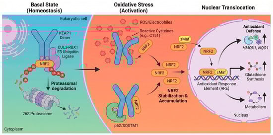 Schematic of the NRF2-KEAP1 signaling pathway. Basal state: Under homeostatic conditions, KEAP1 binds NRF2 in the cytoplasm and serves as an adaptor for the CUL3-RBX1 E3 ubiquitin ligase complex, targeting NRF2 for proteasomal degradation [16]. Oxidative stress: ROS or electrophiles modify reactive cysteine residues on KEAP1 (e.g., C151), causing a conformational change [18]. This inhibits ubiquitination, allowing NRF2 to accumulate. Non-classic mechanisms, such as p62/SQSTM1-mediated autophagy, also contribute to NRF2 stabilization [20]. Nuclear translocation: Stabilized NRF2 translocates to the nucleus and heterodimerizes with sMaf. The complex binds to ARE to induce the transcription of genes regulating antioxidant defense (HMOX1, NQO1), glutathione synthesis, and metabolism [20,22]. Created in BioRender. Peng, Y. (2025) https://BioRender.com/xh710le (accessed on 3 February 2026).