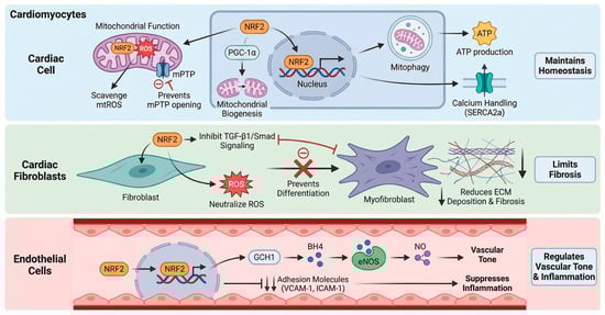 Cell-specific roles of NRF2 in the cardiovascular system. Cardiomyocytes: NRF2 maintains mitochondrial function by scavenging mtROS and preventing mPTP opening [26]. It also promotes mitochondrial biogenesis (via PGC-1α) and mitophagy, ensuring efficient ATP production and calcium handling (e.g., SERCA2a) [27,28]. Cardiac Fibroblasts: NRF2 limits fibrosis by scavenging ROS and inhibiting TGF-β1/Smad signaling [29,30]. This suppression prevents fibroblast-to-myofibroblast differentiation and reduces extracellular matrix (ECM) deposition. Endothelial Cells: NRF2 regulates vascular tone and inflammation. It maintains eNOS coupling via GCH1-mediated BH4 synthesis to ensure NO bioavailability and suppresses the expression of adhesion molecules (VCAM-1, ICAM-1) [31,34]. Created in BioRender. Peng, Y. (2025) https://BioRender.com/v2baujo (accessed on 3 February 2026).