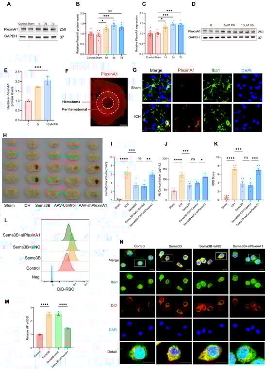 Our observation that higher Sema3B levels correlate with faster neurological recovery after ICH intrigued us, suggesting a potential role for Sema3B in promoting microglial phagocytosis of the hematoma. To further validate this hypothesis, we examined the expression changes of PlexinA1, the receptor for Sema3B, following ICH. Western Blot analysis revealed a time-dependent upregulation of PlexinA1 in mice after ICH compared to the sham group, peaking on day 3 (Figure 2A,B). Concurrently, quantitative real-time PCR (qPCR) results confirmed this trend at the mRNA level (Figure 2C). Furthermore, in microglia stimulated with hemoglobin (Hb), the protein level of PlexinA1 increased in a concentration-dependent manner with Hb (Figure 2D,E). Subsequently, immunofluorescence staining showed increased PlexinA1 expression in the perihematomal region at 72 h after ICH (Figure 2F). Co-immunofluorescence of Iba1 and PlexinA1 demonstrated increased PlexinA1 expression in microglia at day 3 after ICH (Figure 2G). Based on these data, we conclude that neuron–microglia interactions mediated by the Sema3B–PlexinA1 signaling pathway may be crucial in the pathophysiology of ICH.