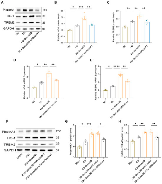 Sema3B increases HO-1 and TREM2 expression in perihematomal brain tissue and microglia after ICH. (A–C) Immunoblotting showing relative HO-1 and TREM2 protein expression in microglia under the different treatments (n = 4). (D,E) Quantitative PCR (qRT-PCR) assessment of HO-1 and TREM2 transcript levels in microglia under the different treatments (n = 3). (F–H) Protein analysis by Western blot for HO-1 and TREM2 in perihematomal tissue from ICH mice on post-ICH day 3 under the different treatments (n = 4) (* p < 0.05, ** p < 0.01, *** p < 0.001, **** p < 0.0001).