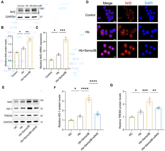 Sema3B upregulates HO-1 and TREM2 expression via Nrf2. (A,B) Immunoblotting for relative Nrf2 protein expression in microglia under the different treatments (n = 3). (C) Quantitative PCR (qRT-PCR) assessment of relative Nrf2 transcript levels in microglia under the different treatments (n = 3). (D) Confocal micrographs depicting Nrf2 expression in microglia under the different treatments (n = 3; scale bar = 10 μm). (E–G) Protein analysis by Western blot for HO-1 and TREM2 in microglia under the different treatments (n = 3) (* p < 0.05, ** p < 0.01, *** p < 0.001, **** p < 0.0001).