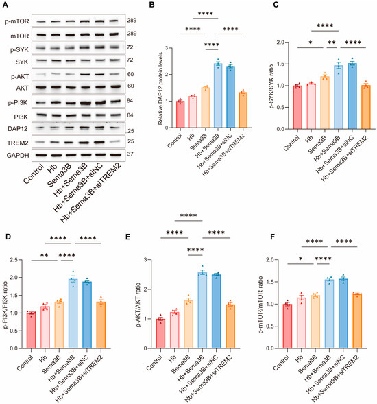 Treatment with Hb alone did not result in an apparent increase in the levels of DAP12, p-SYK, p-PI3K, p-AKT, or p-mTOR. In contrast, Sema3B treatment alone significantly increased the levels of DAP12 and the phosphorylation of SYK, PI3K, AKT, and mTOR. Notably, combined treatment with Hb and Sema3B led to a more pronounced elevation of these signaling proteins compared with Sema3B treatment alone, indicating activation of the TREM2/DAP12/SYK/PI3K/AKT pathway. Importantly, these effects were not altered by siNC but were markedly reversed by siTREM2, demonstrating that Sema3B-mediated activation of this pathway is dependent on TREM2 signaling (Figure 5A–F).