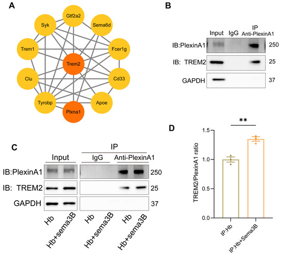 Interaction between PlexinA1 and TREM2 in microglia is enhanced by Sema3B, synergistically promoting hematoma phagocytosis. (A) The interaction network between PlexinA1 and TREM2 was determined using the STRING database (https://string-db.org (accessed on 2 June 2025)) and subsequently plotted with Cytoscape software (v3.10). (B) Detection of the PlexinA1–TREM2 interaction in microglia under basal conditions by co-immunoprecipitation and immunoblotting. (C,D) Co-immunoprecipitation and immunoblotting analyses of the PlexinA1–TREM2 interaction in microglia under the different treatments, with quantification (n = 3) (** p < 0.01).