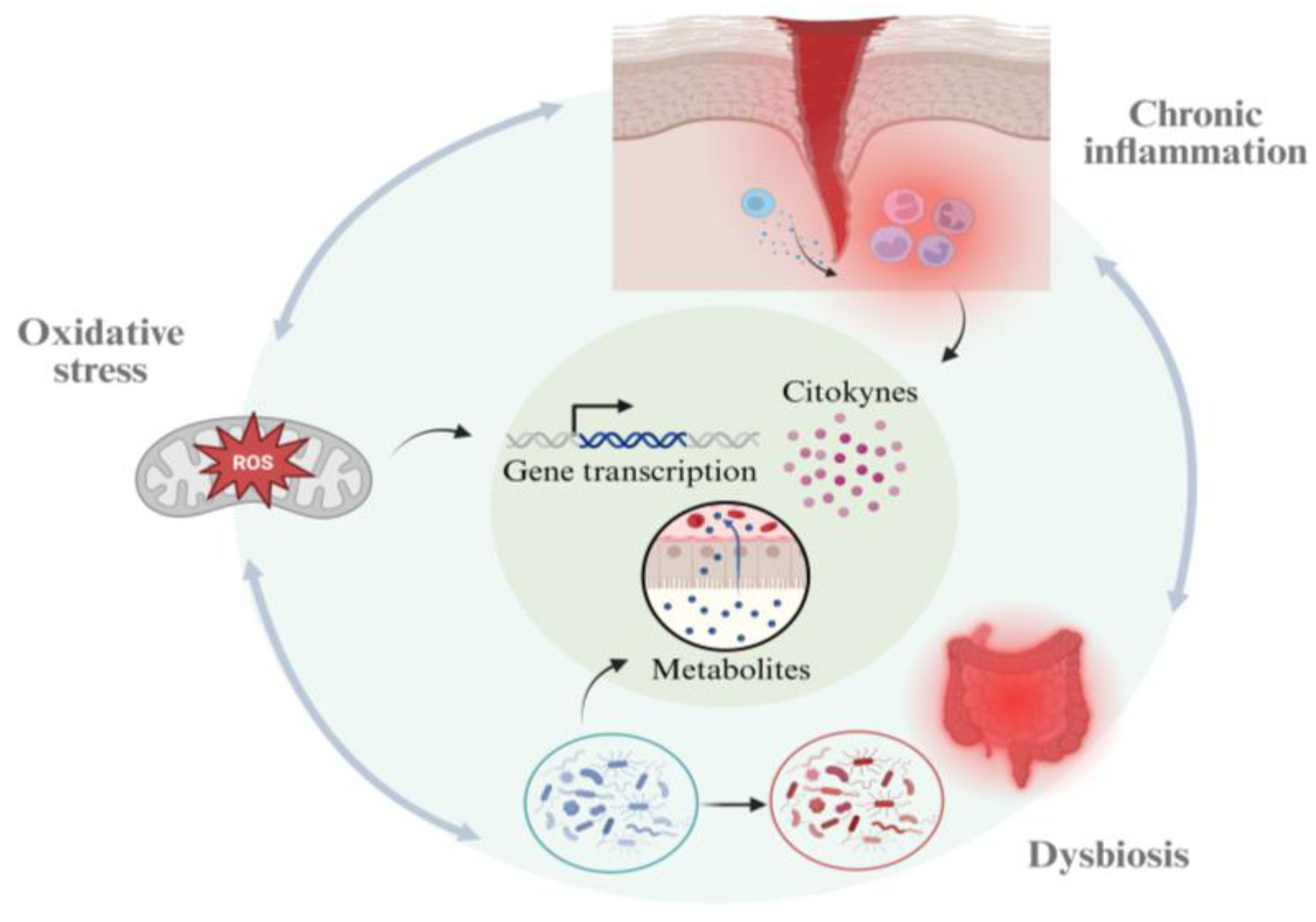 - Mostafavi Abdolmaleky, H.; Zhou, J.R. Gut Microbiota Dysbiosis, Oxidative Stress, Inflammation, and Epigenetic Alterations in Metabolic Diseases. Antioxidants 2024, 13, 985. [Google Scholar] [CrossRef]