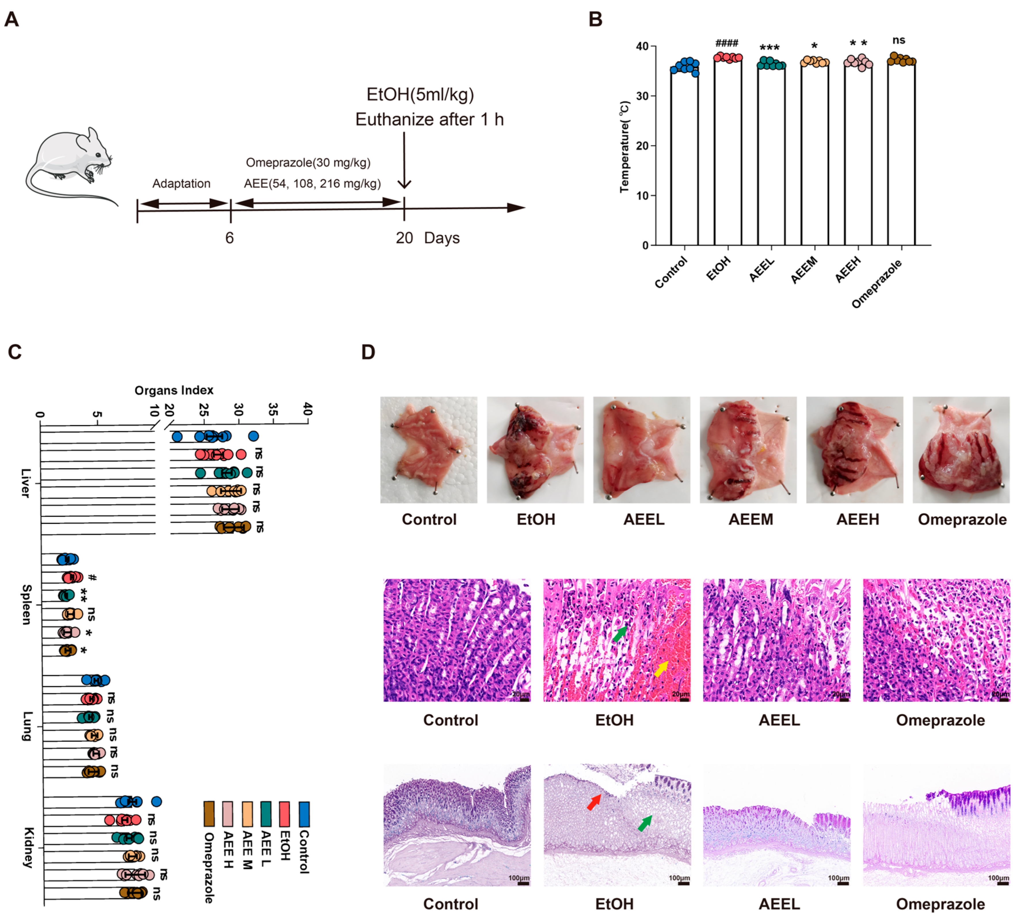 3.1. AEE Prevented EtOH-Induced Gastric Mucosal Injury in Rats