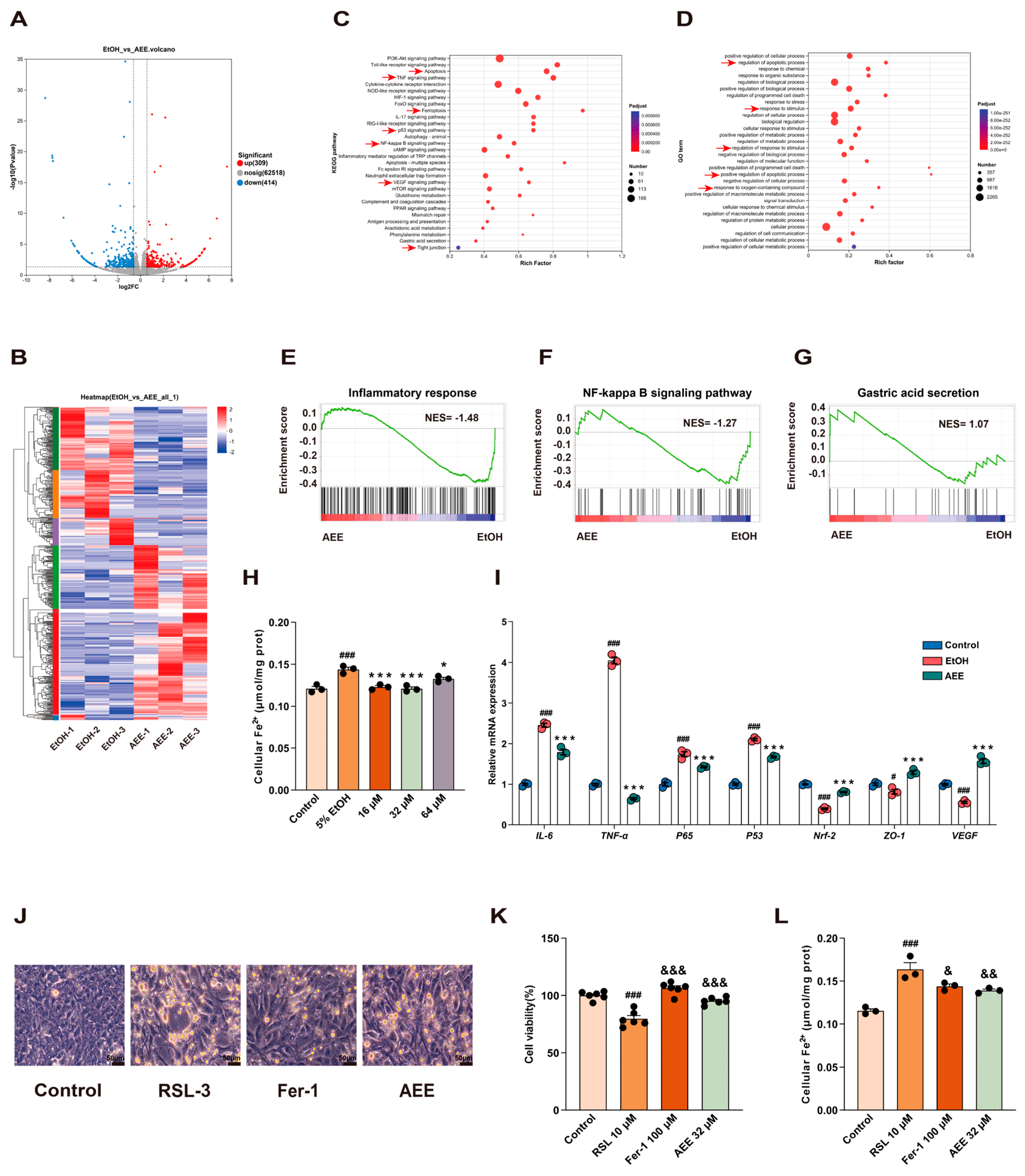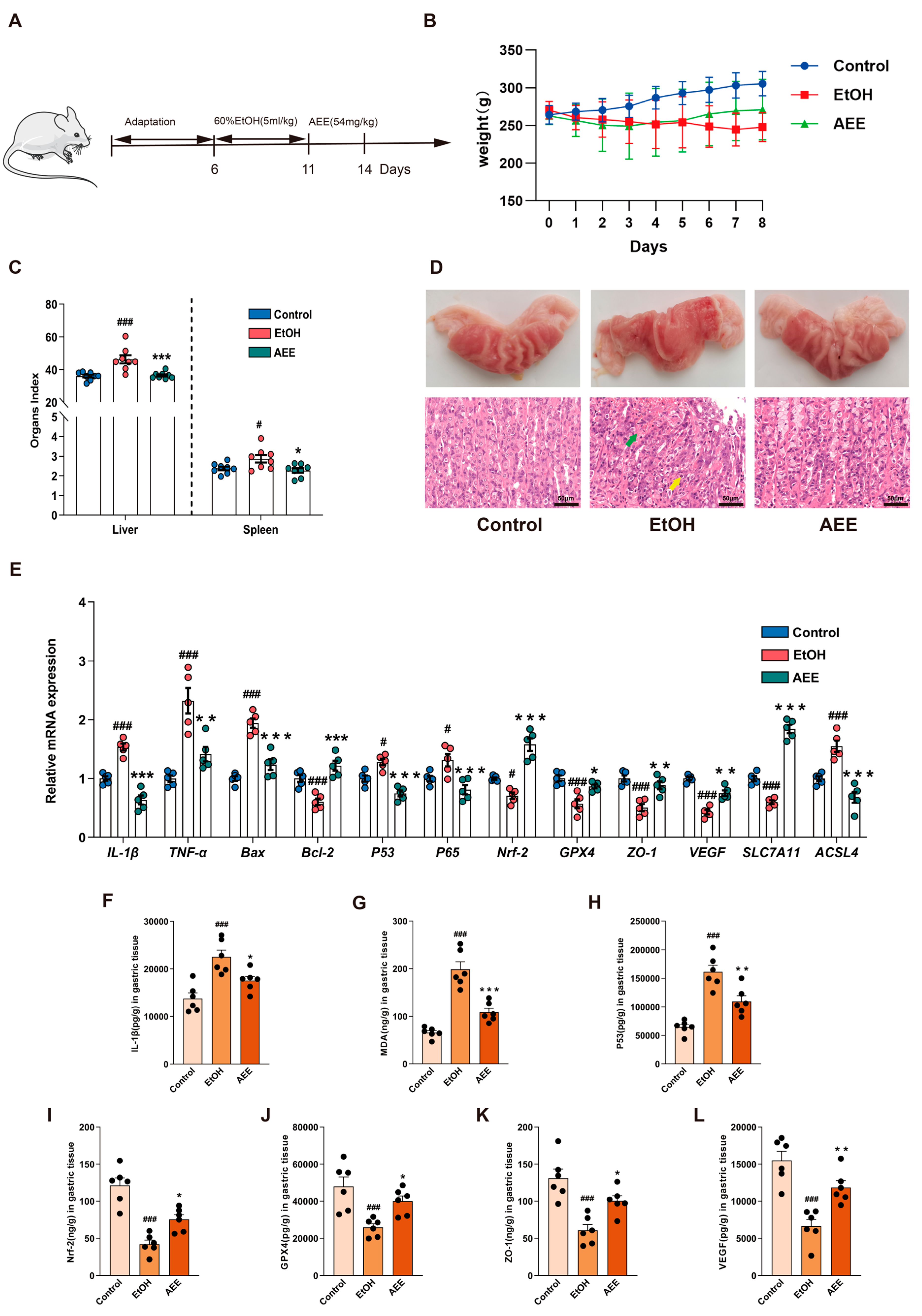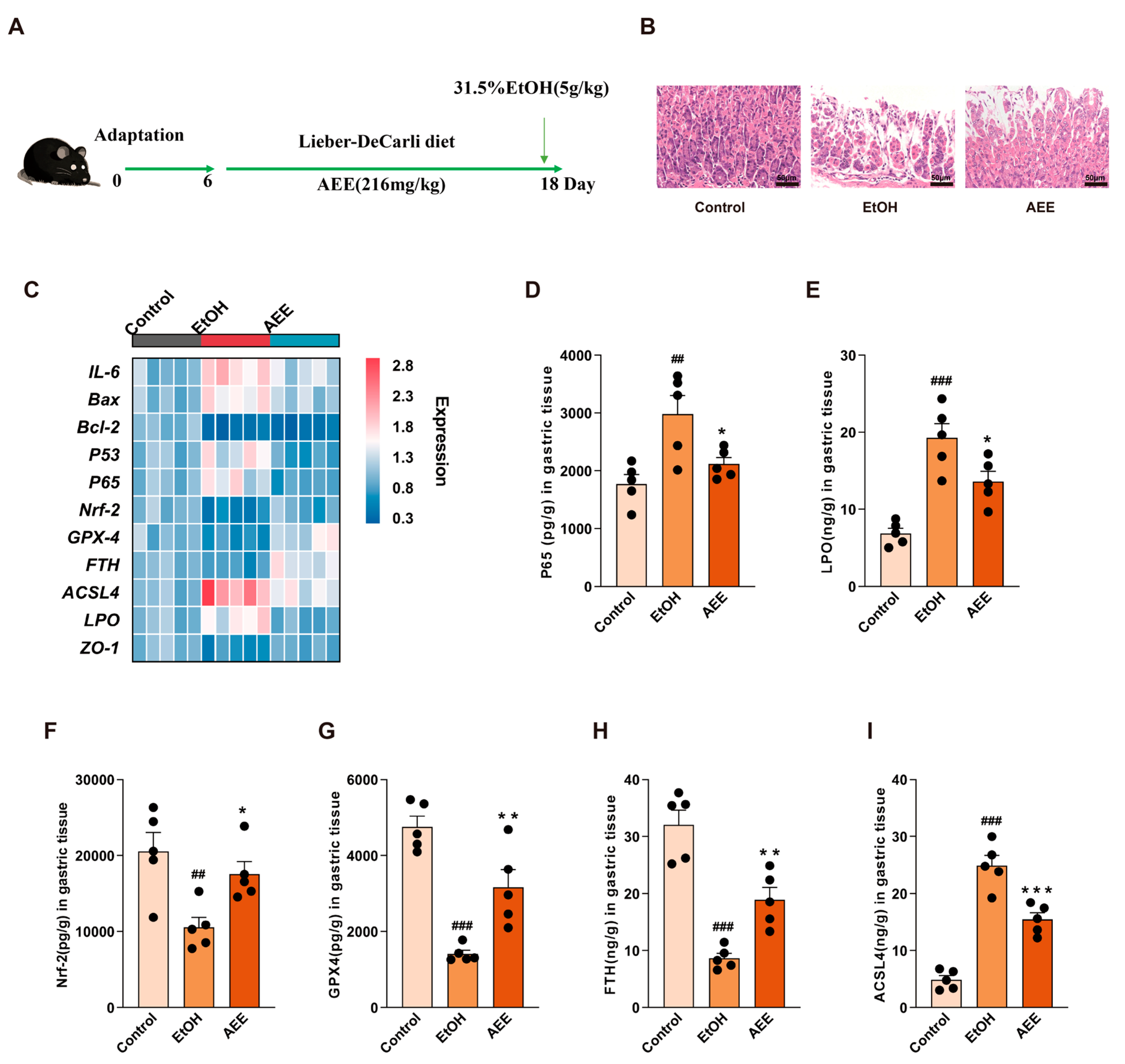 3.5. AEE Alleviated EtOH-Induced Ferroptosis in Rat Gastric Tissue