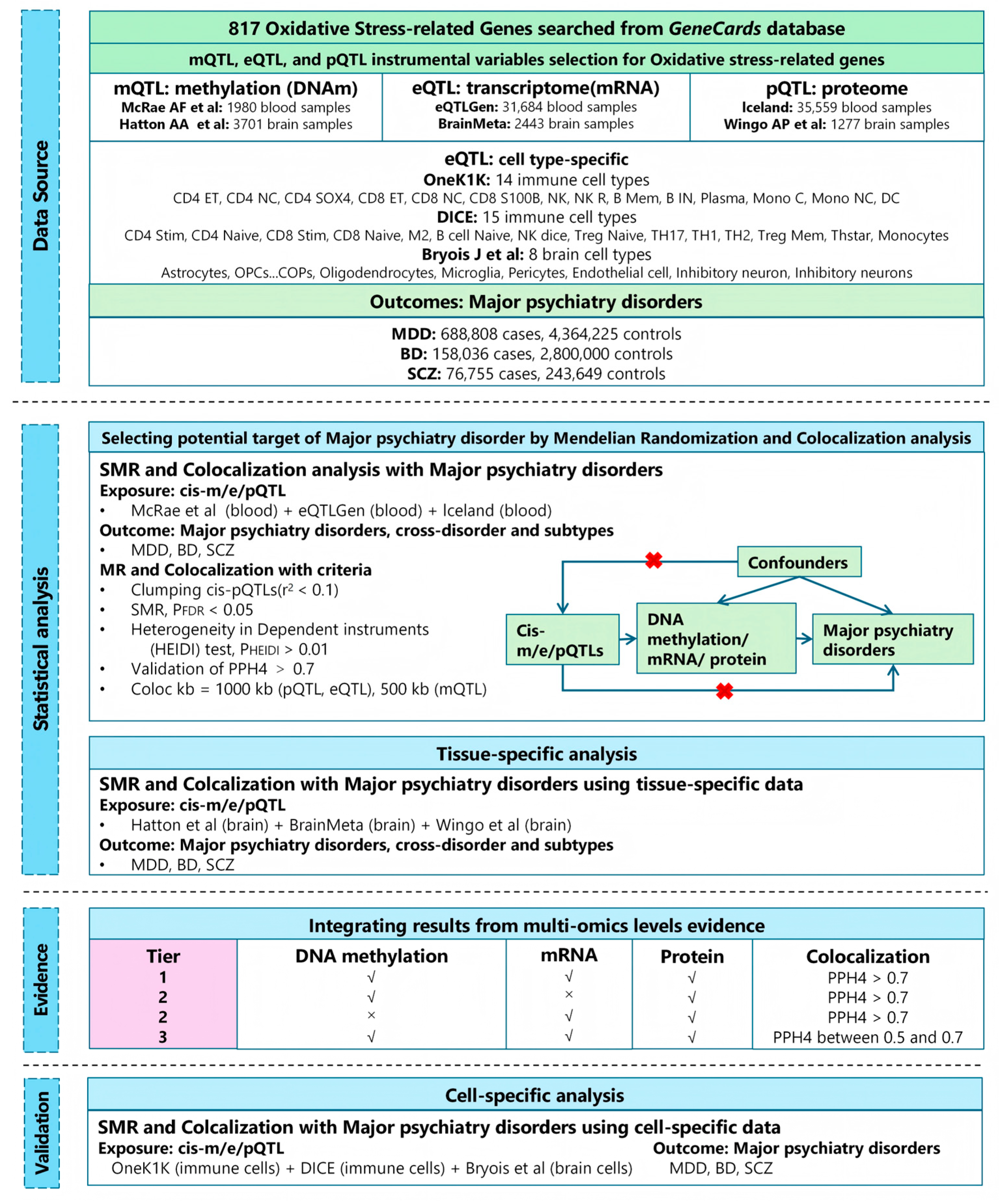 Li, N.; Wang, J.; Chen, S.; Li, T. Integrative Multi-Omics Mendelian Randomization Reveals Oxidative Stress Mechanisms in Major Depressive Disorder, Bipolar Disorder, and Schizophrenia. Antioxidants 2026, 15, 233. https://doi.org/10.3390/antiox15020233