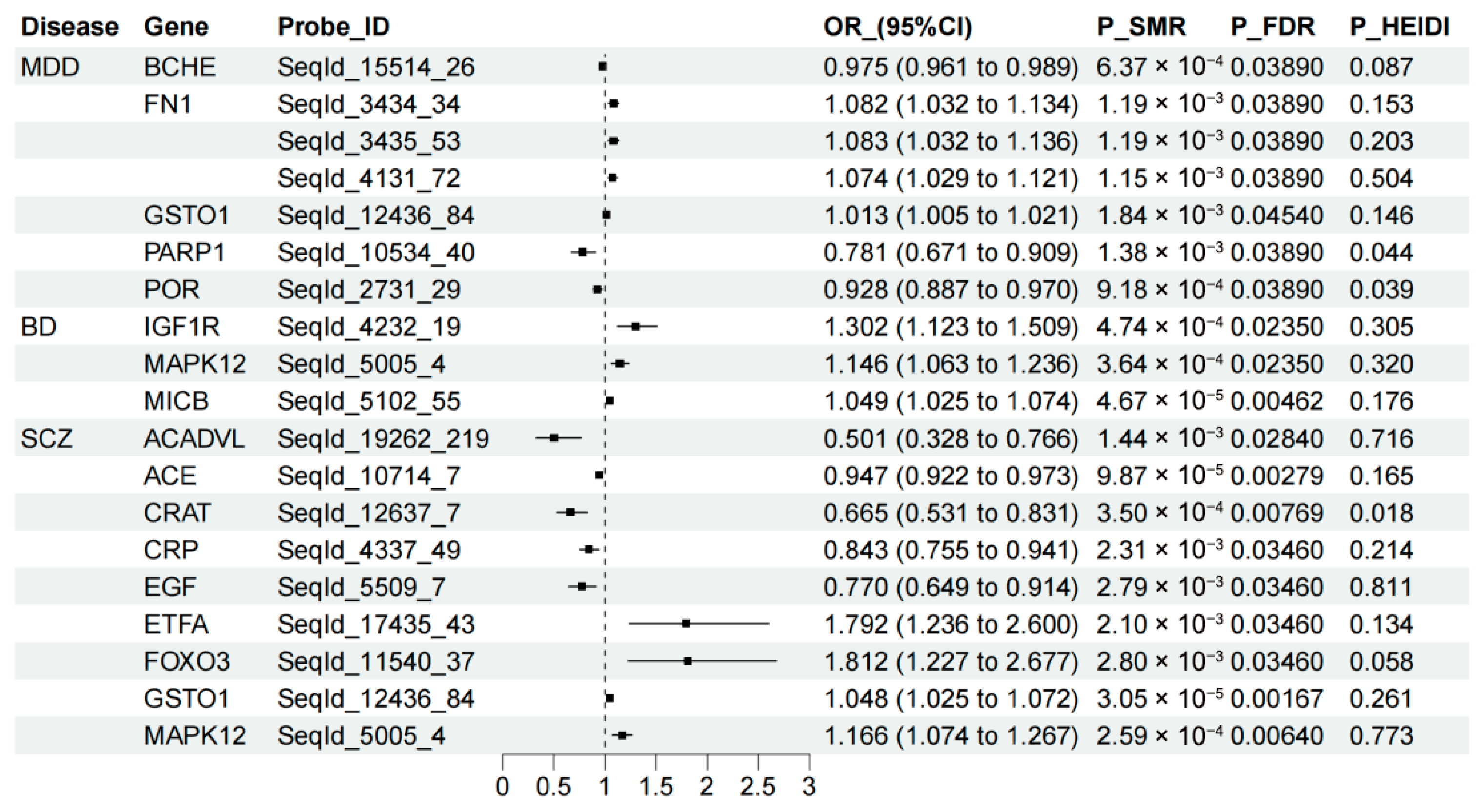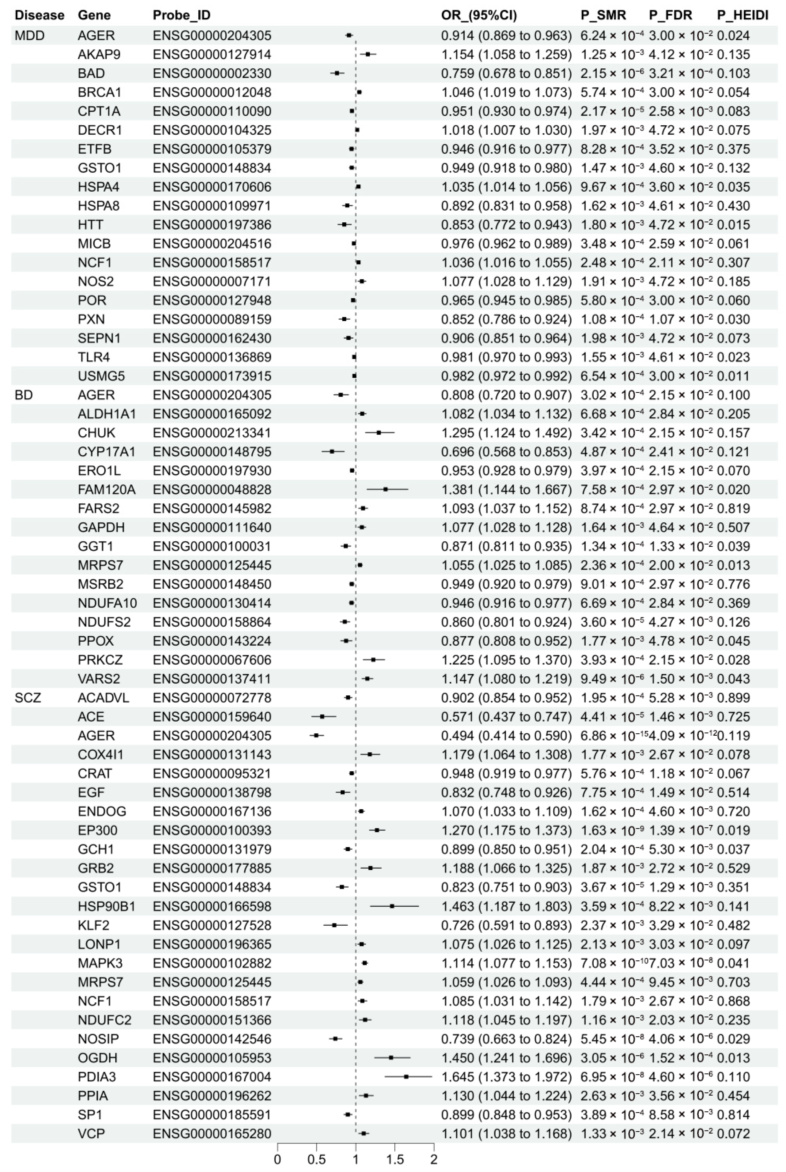 | Probe | OR (95%CI) | P_SMR | P_FDR | OR (95%CI) | P_SMR | P_FDR | OR (95%CI) | P_SMR | P_FDR | PPH4 | ||||