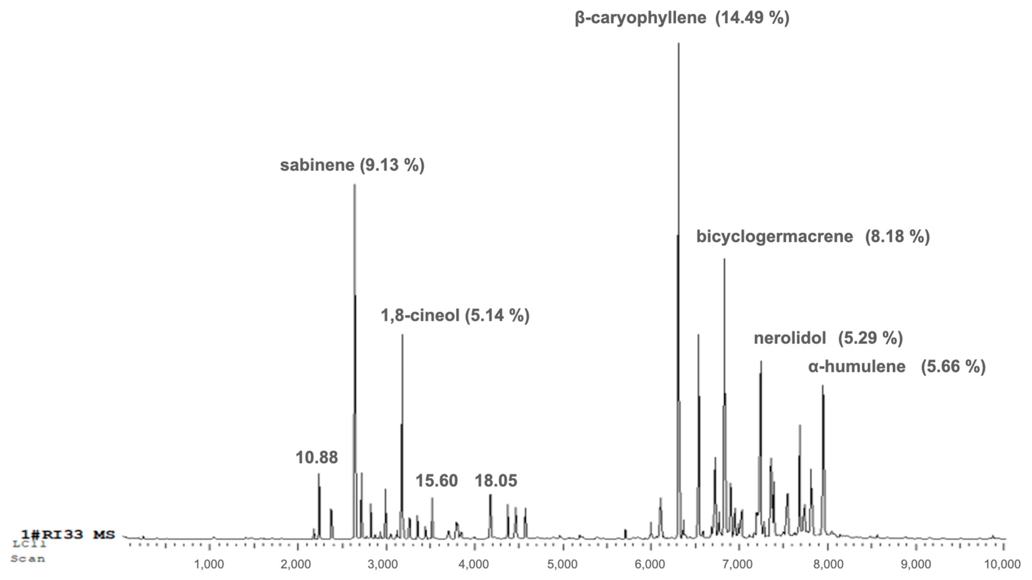 3.2. Phytochemical Characterization of Essential Oil