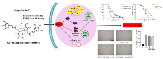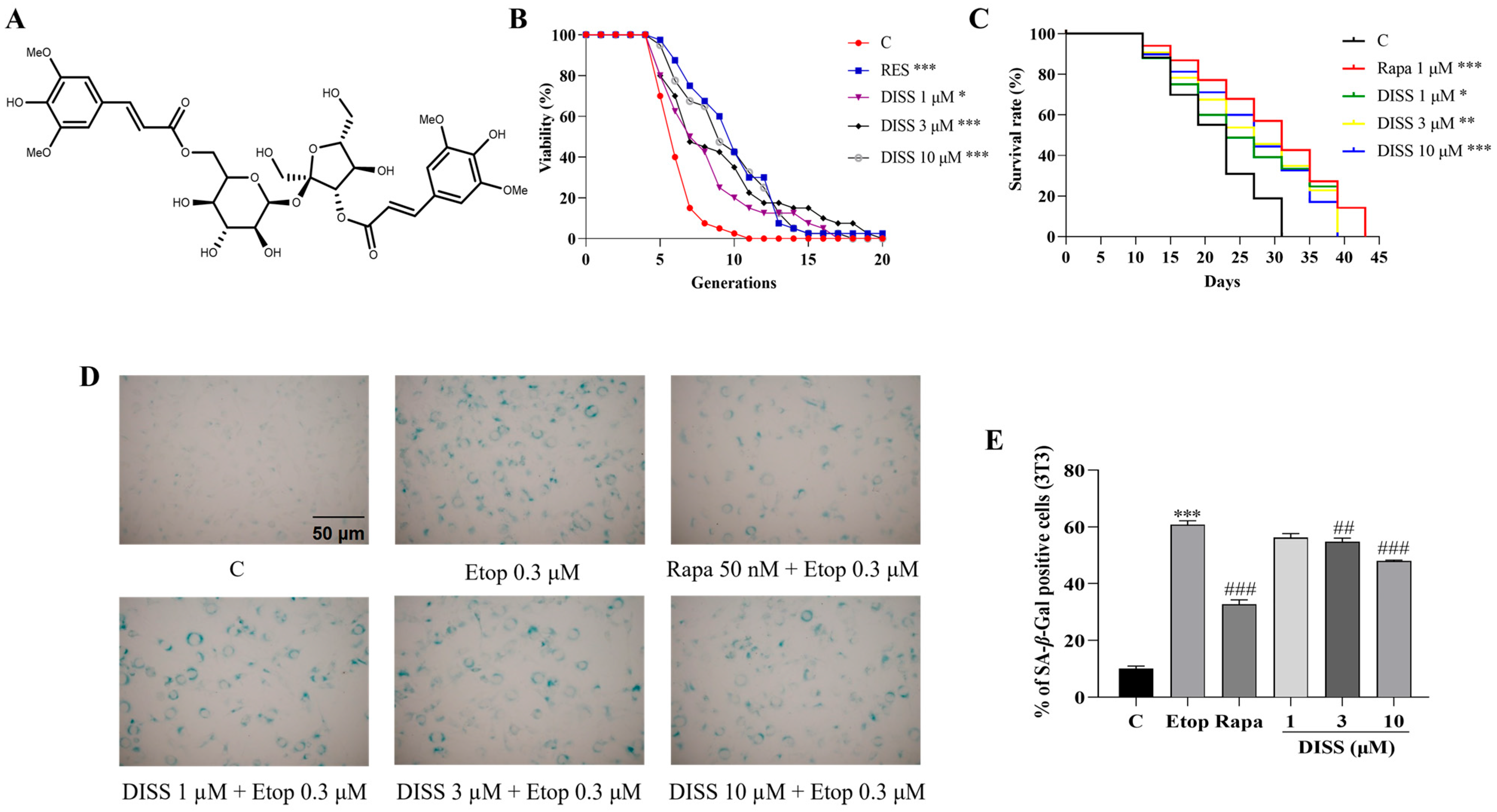 3.1. DISS Prolongs the Lifespan of Yeast and Relieves Etop-Induced Senescence of Mammalian Cells
