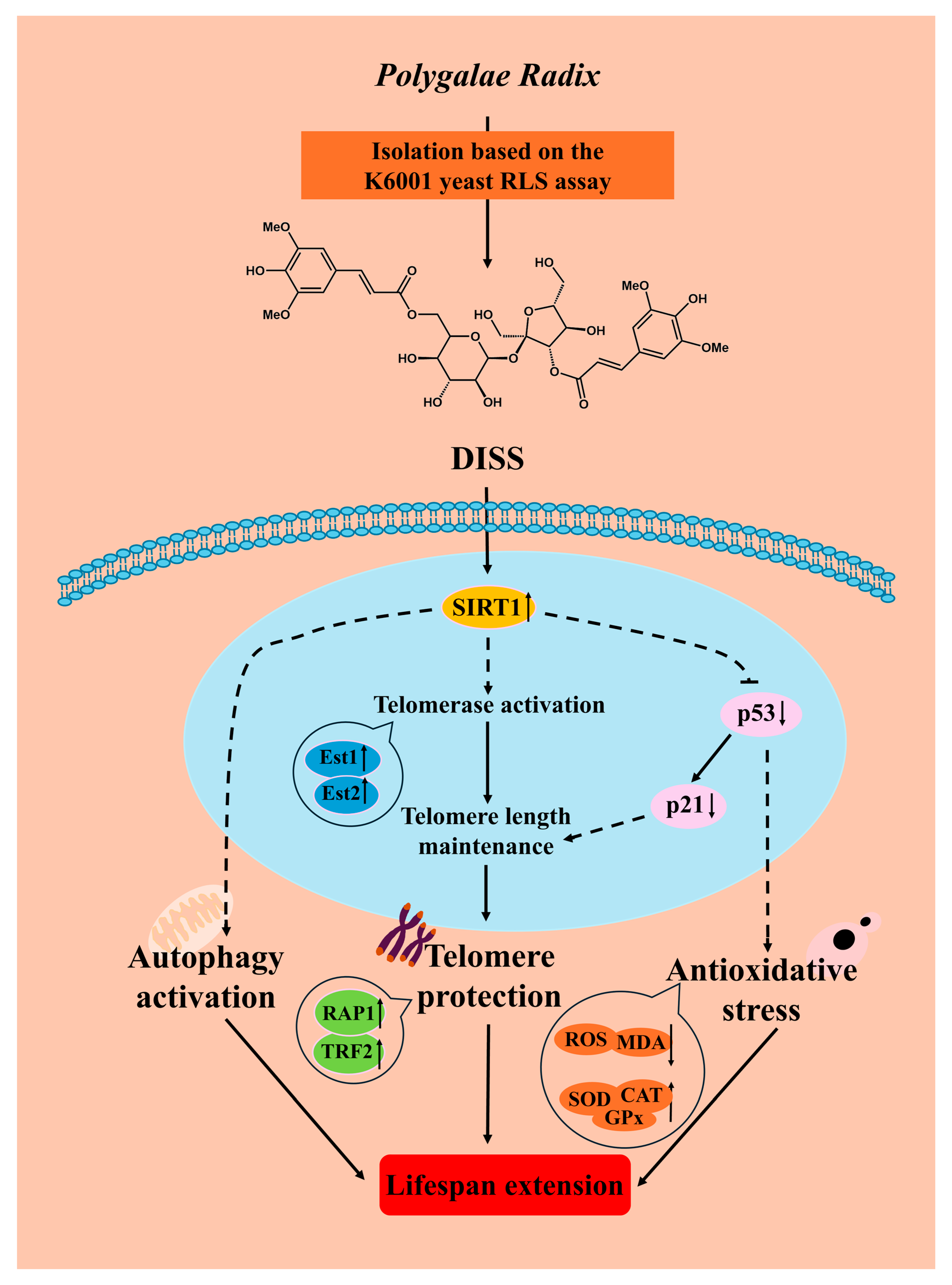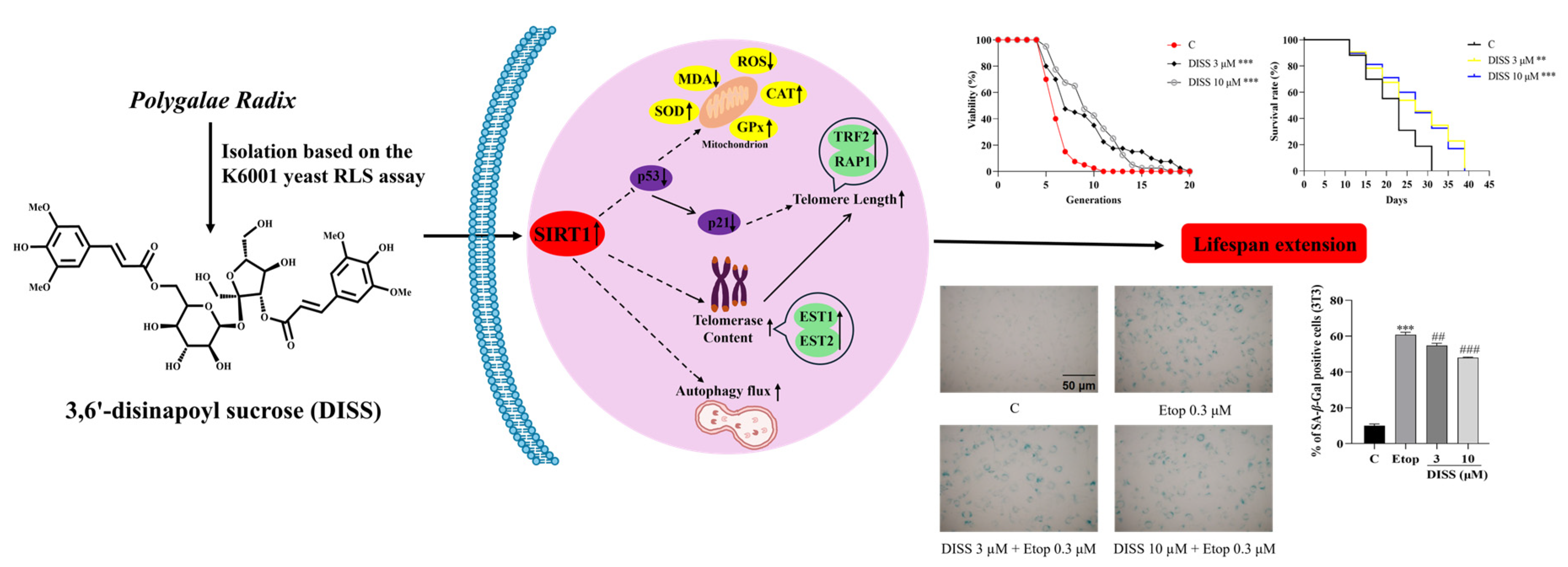 Wang J, Jiang T, Chen S, Li Y, Li Q, Xiang L, Qi J. 3,6′-Disinapoyl Sucrose from Polygalae Radix Exerts Anti-Aging Effects via Modification of Telomeres, SIRT1/p53/p21 Pathway, Oxidative Stress and Autophagy. Antioxidants. 2026; 15(3):313. https://doi.org/10.3390/antiox15030313