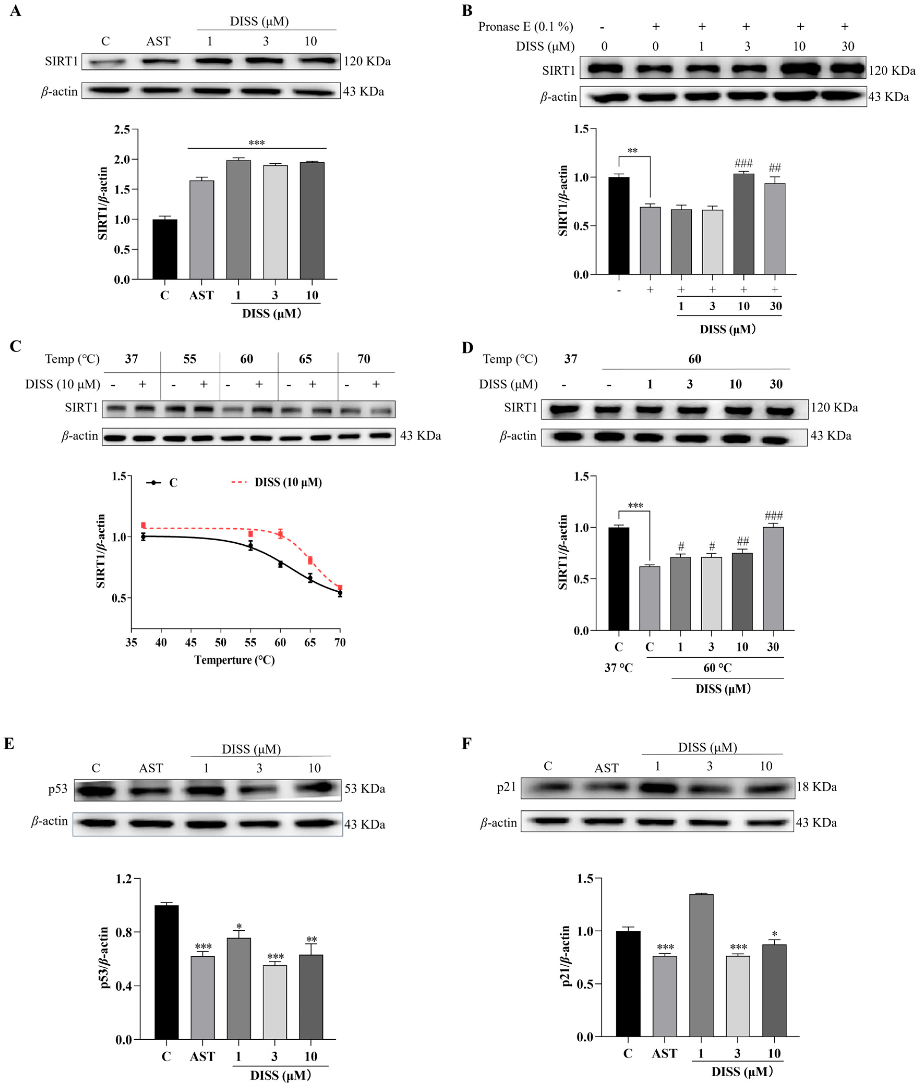 3.2. DISS Potentially Targets SIRT1 and Regulates SIRT1/p53/p21 Pathway