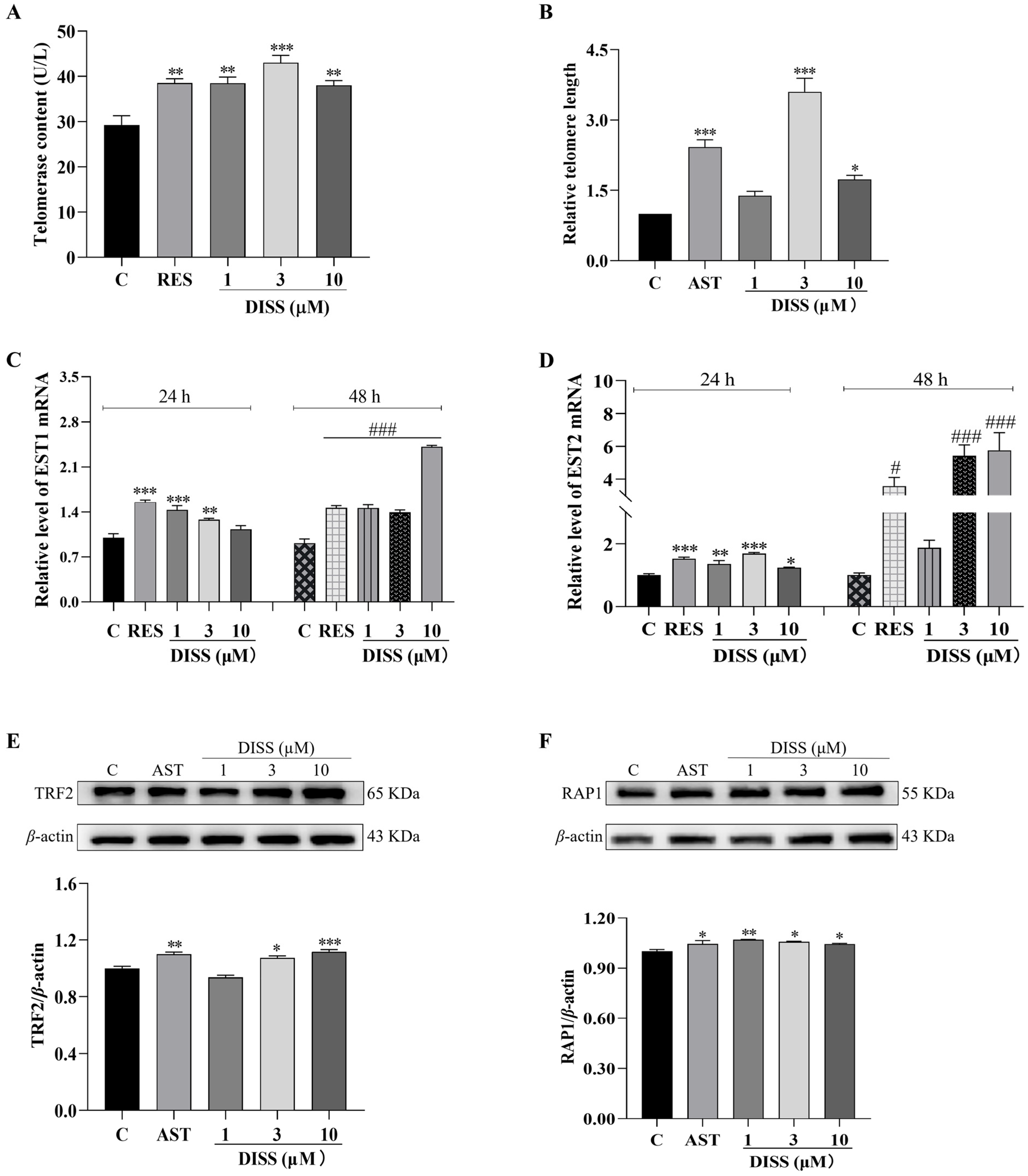 3.3. DISS Increases the Telomerase and Length of Telomeres