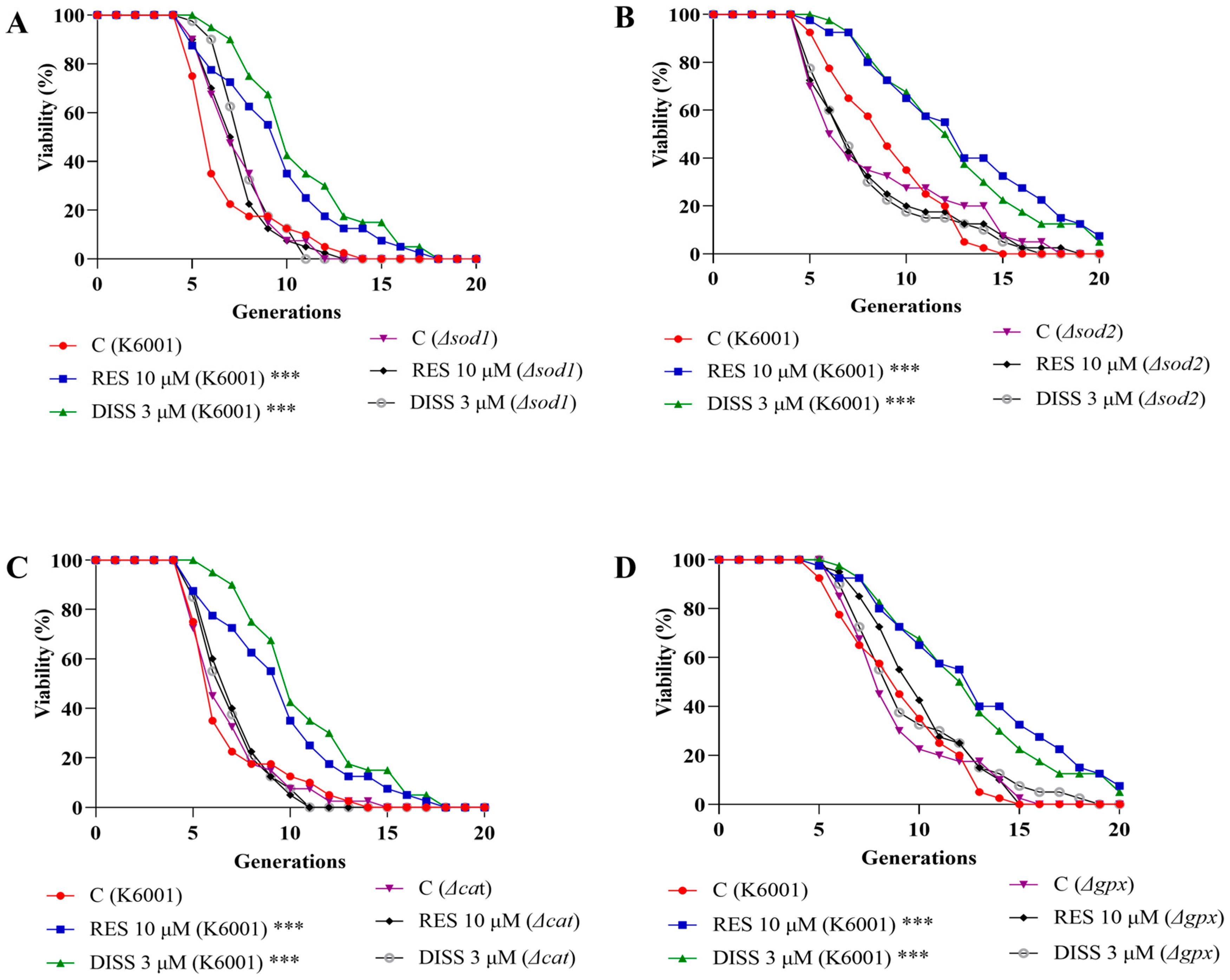 3.5. DISS Cannot Prolong the Lifespan of Yeast Lacking SOD1, SOD2, CAT, and GPx Genes