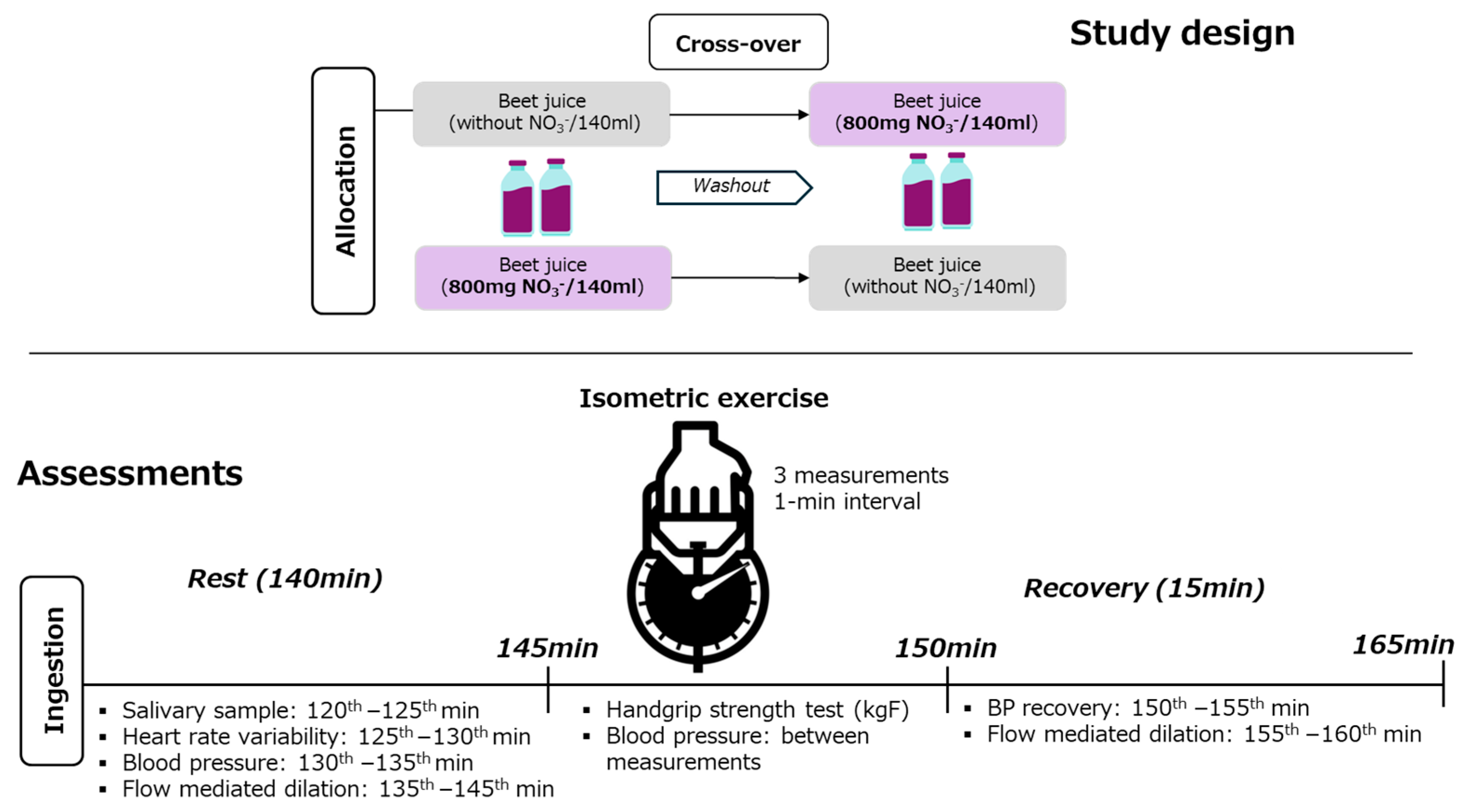 - Notay, K.; Incognito, A.V.; Millar, P.J. Acute Beetroot Juice Supplementation on Sympathetic Nerve Activity: A Randomized, Double-Blind, Placebo-Controlled Proof-of-Concept Study. Am. J. Physiol. Heart Circ. Physiol. 2017, 313, H59–H65. [Google Scholar] [CrossRef] [PubMed]