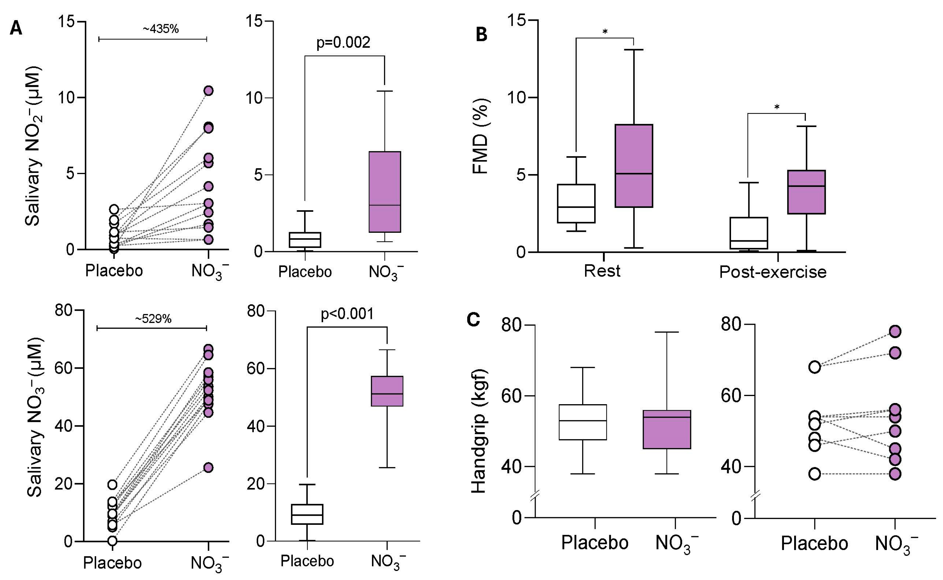- Benjamim, J.; Lopes da Silva, L.S.; Alves Sousa, Y.B.; Gonçalves, L.d.S.; Rodrigues, G.d.S.; Rebelo, M.A.; Tanus-Santos, J.E.; Valenti, V.E.; Bueno Júnior, C.R. Dietary Inorganic Nitrate Accelerates Cardiac Parasympathetic Recovery After Exercise in Older Women with Hypertension: A Secondary Analysis of a Randomised Crossover Study. Metabolites 2025, 15, 789. [Google Scholar] [CrossRef]