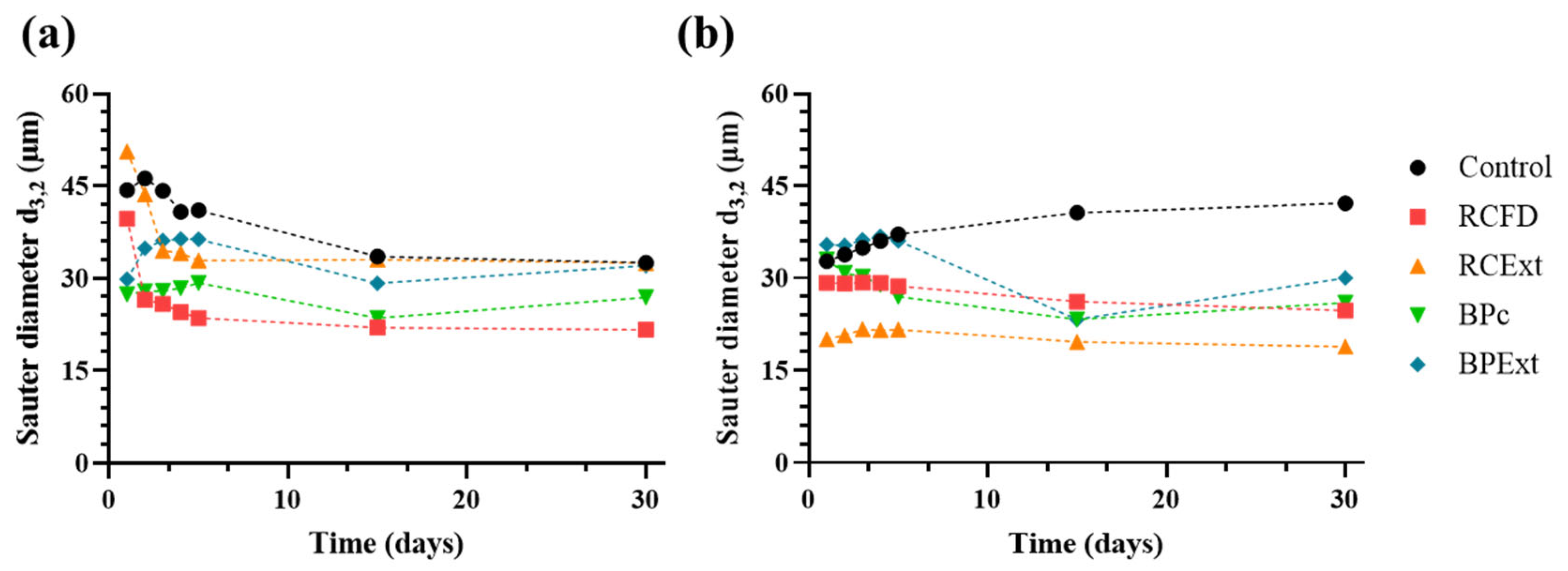 3.4. Droplet Size Stability over Time