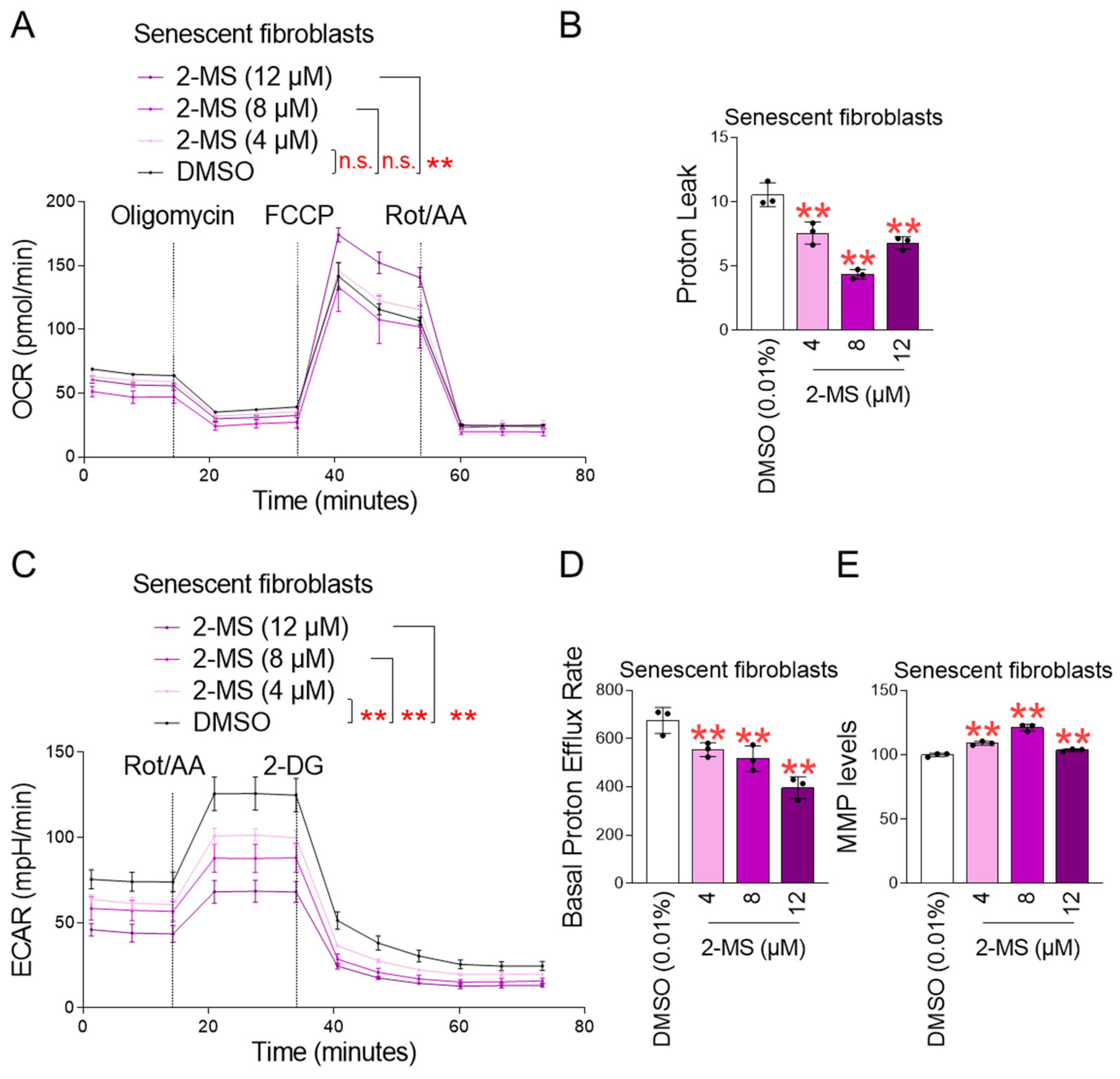 Figure 2. 2-MS restores mitochondrial function in senescent fibroblasts. Senescent fibroblasts treated with DMSO (0.01%) or 2-MS (4, 8, and 12 μM) for 12 days at 4-day intervals. Oxygen consumption rate (OCR; pmol/min) and proton leak were measured using the Seahorse XF Mito Stress Test Kit (A,B). ECAR and basal proton efflux rate were measured using the Seahorse XF Glycolytic Rate Assay Kit (C,D). Flow cytometric analysis of mitochondrial membrane potential (MMP) using JC-1 (E). Statistical significance of OCR and ECAR was assessed using two-way ANOVA followed by Bonferroni’s post hoc test, with results considered not significant (n.s.) or significant at ** p < 0.01. Data represent the mean ± S.D., n = 5. Statistical significance of proton leak, basal proton efflux, and MMP levels were assessed using one-way ANOVA followed by Bonferroni’s post hoc test, with results considered significant at ** p < 0.01. Data represent the mean ± S.D., n = 3.