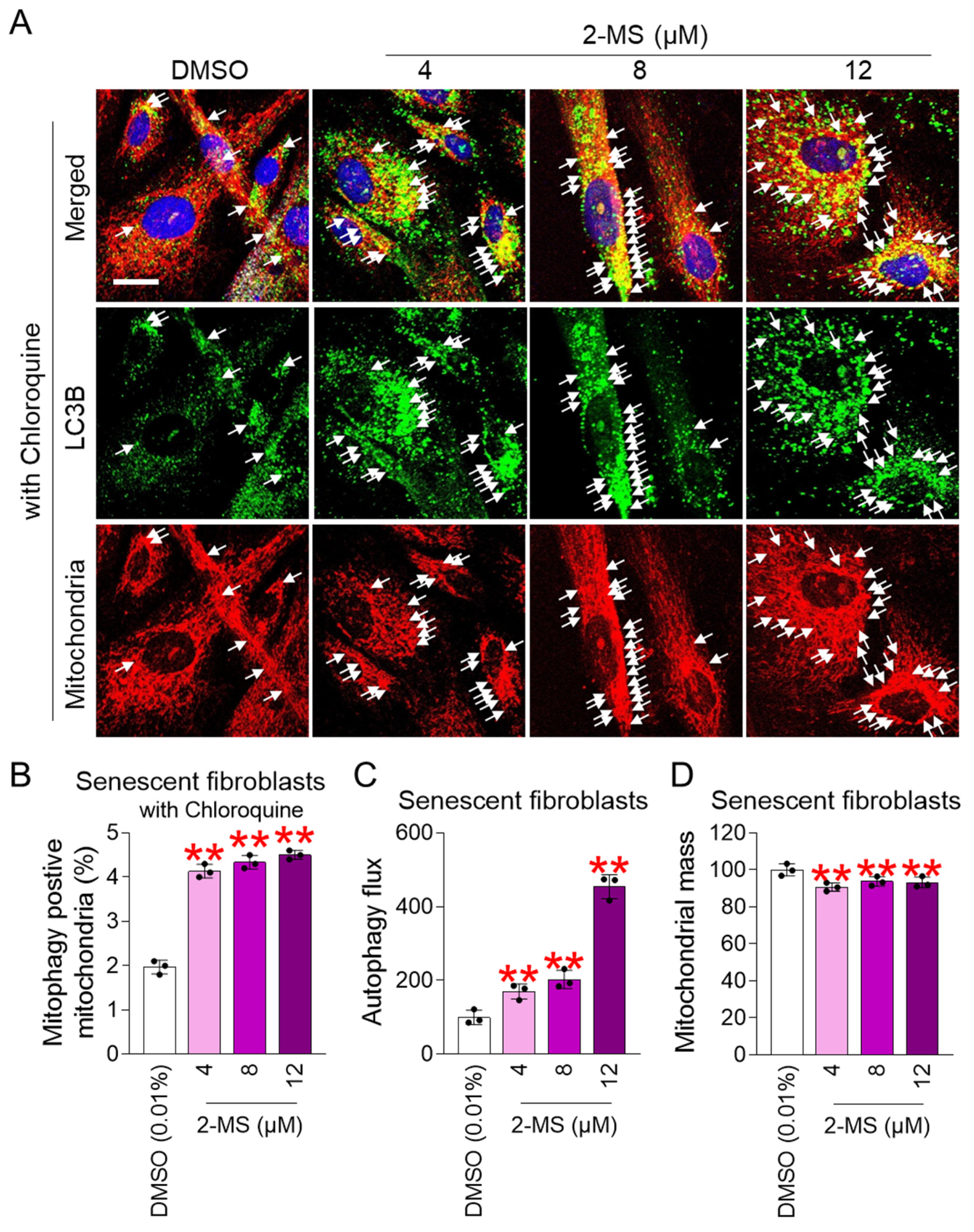 Figure 3. 2-MS eliminates dysfunctional mitochondria through mitophagy. (A,B) Senescent fibroblasts were treated with DMSO (0.01%) or 2-MS (4, 8, 12 μM) at 4-day intervals for 12 days. During drug treatment, senescent fibroblasts were co-treated with chloroquine 24 h before immunostaining. Then, immunostaining for LC3B (green) and mitochondria (red) was performed. The nucleus was stained with Hoechst 33342 (blue). Scale bar 10 μm. Mitophagy is indicated by a white arrow. (C,D) Autophagy flux or mitochondrial mass was measured in senescent fibroblasts treated with DMSO (0.01%) or 2-MS (4, 8, and 12 μM) for 12 days at 4-day intervals. Statistical analysis was performed using one-way ANOVA followed by Bonferroni’s post hoc test, with results considered significant at ** p < 0.01. Data represent the mean ± S.D., n = 3.