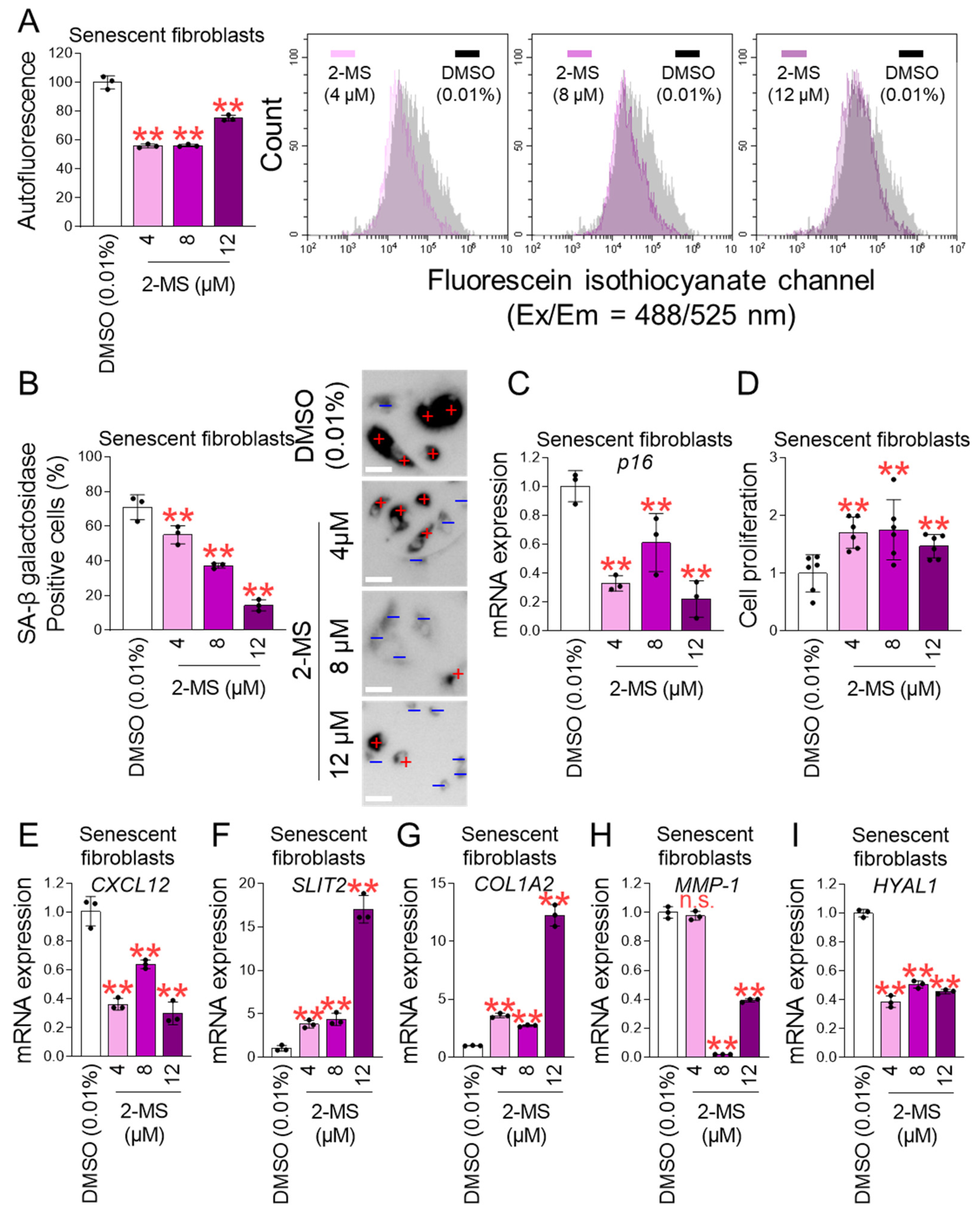 Figure 4. 2-MS improves senescence-associated phenotypes. Senescent fibroblasts treated with DMSO (0.01%) or 2-MS (4, 8, 12 μM) at 4-day intervals for 12 days. Then, autofluorescence (A), senescence-associated β-galactosidase (SA-β-gal) (B), p16 (C), cellular proliferation (D), CXCL12 (E), SLIT2 (F), COL1A2 (G), MMP-1 (H), and HYAL1 expression (I) were measured. (A) Representative flow graphs of autofluorescence. (B) + indicates SA-β galactosidase-positive cells. − indicates SA-β galactosidase negative cells. Scale bar: 10 μm. Statistical analysis was performed using one-way ANOVA followed by Bonferroni’s post hoc test, with results considered not significant (n.s.) or significant at ** p < 0.01. Data represent the mean ± S.D., n = 3.