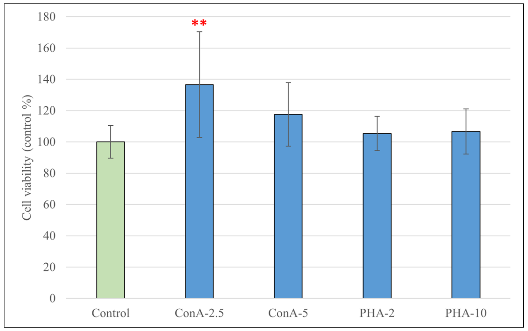 - Huldani, H.; Rashid, A.I.; Turaev, K.N.; Opulencia, M.J.C.; Abdelbasset, W.K.; Bokov, D.O.; Mustafa, Y.F.; Al-Gazally, M.E.; Hammid, A.T.; Kadhim, M.M.; et al. Concanavalin A as a promising lectin-based anti-cancer agent: The molecular mechanisms and therapeutic potential. Cell Commun. Signal 2022, 20, 167. [Google Scholar] [CrossRef] [PubMed]