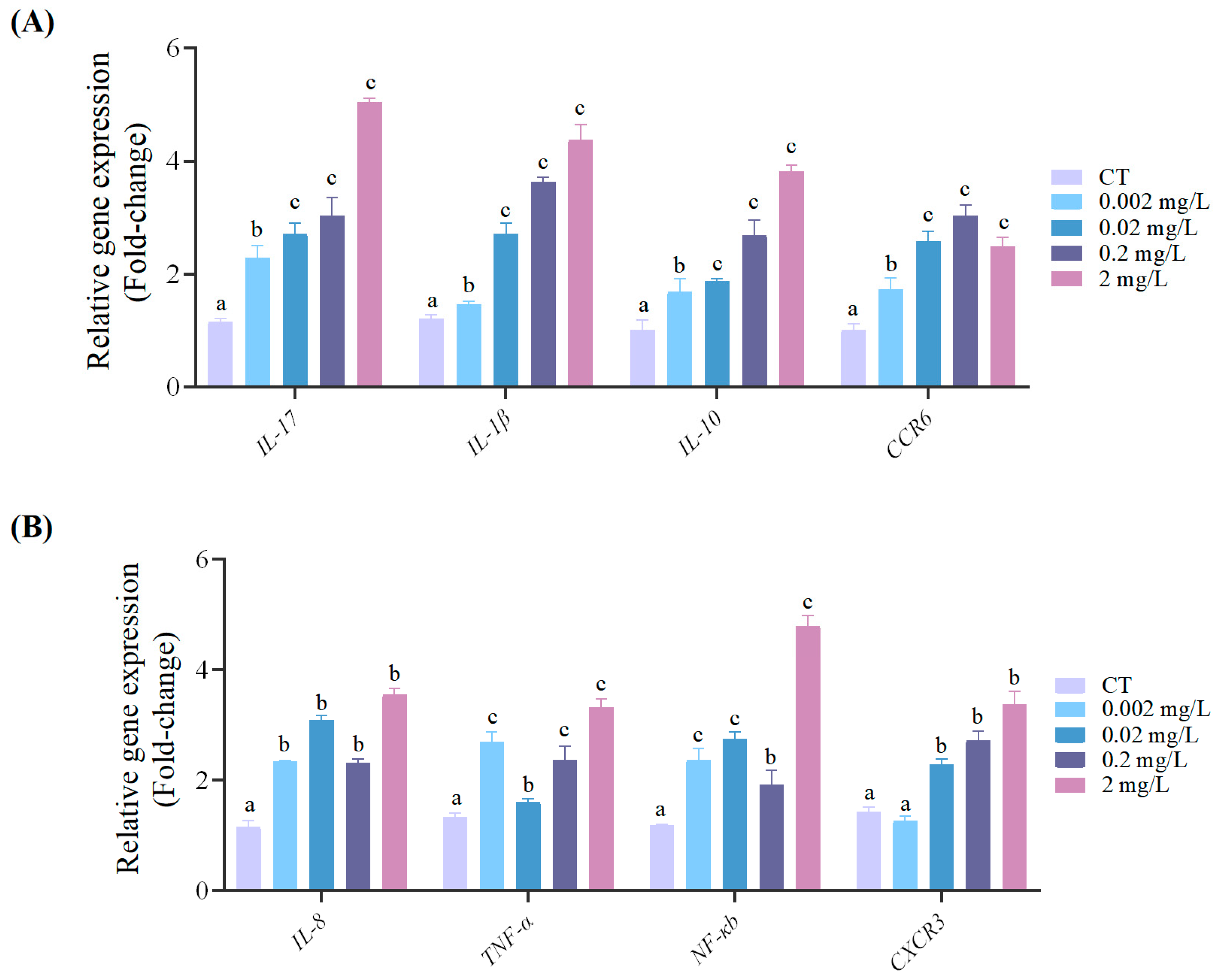 3.5. Effect of F-53B on the Expression of Immune-Related Genes