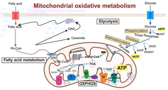 Mitochondrial oxidative metabolism is precisely regulated by multiple factors, such as substrate availability, hormonal signals, and cellular energy demands. For instance, during fasting or exercise, the expression of oxidative metabolism-related genes increases to meet elevated energy requirements. The dysregulation of mitochondrial oxidative metabolism is linked to numerous diseases, including metabolic disorders, neurodegenerative diseases, cardiovascular diseases, and aging-related conditions [28,29]. Therefore, understanding the mechanisms and regulation of mitochondrial oxidative metabolism is essential for developing therapeutic interventions to restore cellular energy balance and mitigate oxidative stress (Figure 1).