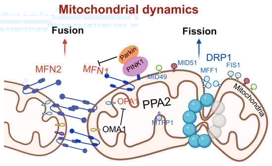 Mitochondria are highly dynamic organelles that undergo continuous cycles of fusion and fission to modulate their morphology, size, and location. This physiological process is known as mitochondrial dynamics [30]. The relative balance between mitochondrial fission and fusion is crucial for maintaining mitochondrial quality and function, which is of great significance to normal cellular activities [31,32].