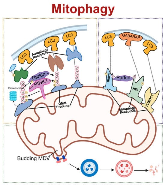 Schematic of molecular regulatory mechanisms for mitophagy. The three primary pathways of mitochondrial autophagy: On the left is the PINK1/Parkin-dependent pathway, where PINK1 recruits Parkin to ubiquitinate outer-mitochondrial-membrane proteins, subsequently recruiting autophagy receptors that bind LC3. On the right is the receptor-mediated pathway, where receptors such as Nix, BNIP3, and FUNDC1 directly bind to LC3/GABARAP. Below is the mitochondrial-derived vesicle (MDV) pathway. Together, these three pathways mediate the selective autophagic degradation of mitochondria. LC3, microtubule-associated protein 1 light chain 3; PINK1, PTEN-induced kinase 1; Parkin, E3 ubiquitin–protein ligase parkin; OMM, outer mitochondrial membrane; MDV, mitochondrial-derived vesicle; BNIP3, BCL2/adenovirus E1B 19 kDa interacting protein 3; NIX, NIP3-like protein X; FUNDC1, FUN14 domain containing 1; GABARAP, gamma–aminobutyric acid receptor-associated protein. Created in BioRender. Zou, W. (2026) https://BioRender.com/epmyj4i, accessed on 3 March 2026.