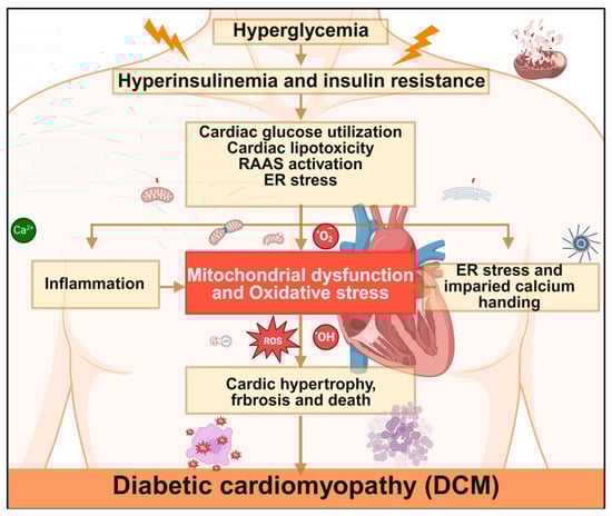 Mechanisms of diabetic cardiomyopathy. Hyperglycemia triggers cardiac metabolic disorders through hyperinsulinemia and insulin resistance, leading to mitochondrial dysfunction and oxidative stress. This subsequently induces inflammation, endoplasmic reticulum stress, and impaired calcium handling, ultimately promoting the development of DCM. RAAS, renin–angiotensin–aldosterone system; ER, endoplasmic reticulum; ROS, reactive oxygen species. Created in BioRender. Zou, W. (2026) https://BioRender.com/cmufxug, accessed on 3 March 2026.