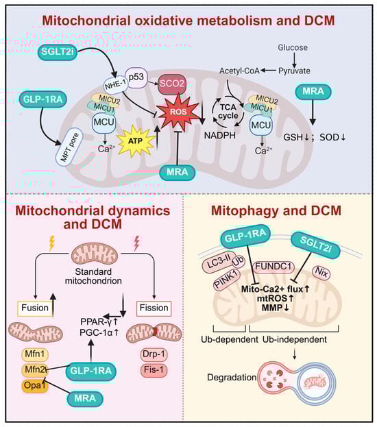 Drugs target mitochondrial homeostasis for diabetic cardiomyopathy. SGLT2i, GLP-1RA, and MRA improve DCM by multidimensionally regulating mitochondrial function. At the oxidative metabolism level, SGLT2i and GLP-1RA stabilize mitochondrial Ca2+ homeostasis, reduce oxidative stress, and promote ATP production. In mitochondrial dynamics, all three classes synergistically promote mitochondrial fusion and inhibit excessive fission. Regarding mitochondrial autophagy, they accelerate the clearance of damaged mitochondria by activating both PINK1/Parkin-dependent and FUNDC1-mediated independent pathways, thereby exerting comprehensive cardioprotective effects. DCM, diabetic cardiomyopathy; SGLT2i, sodium–glucose cotransporter 2 inhibitors; GLP-1RA, glucagon-like peptide-1 receptor agonist; MRA, mineralocorticoid receptor antagonists; NHE-1, sodium/hydrogen exchanger; MICU1, mitochondrial calcium uptake 1; MICU2, mitochondrial calcium uptake 2; MCU, mitochondrial calcium uniporter; p53, tumor protein p53; SCO2, synthesis of cytochrome C oxidase 2; MPT pore, mitochondrial permeability transition pore; GSH, glutathione; SOD, superoxide dismutase; NADPH, nicotinamide adenine dinucleotide phosphate; PPAR-γ, peroxisome proliferator-activated receptor γ; PGC-1α, peroxisome proliferator-activated receptor gamma coactivator 1-alpha; mtROS, mitochondrial reactive oxygen species; MMP, mitochondrial membrane potential. Created in BioRender. Zou, W. (2026) https://BioRender.com/tpghv6y, accessed on 3 March 2026.