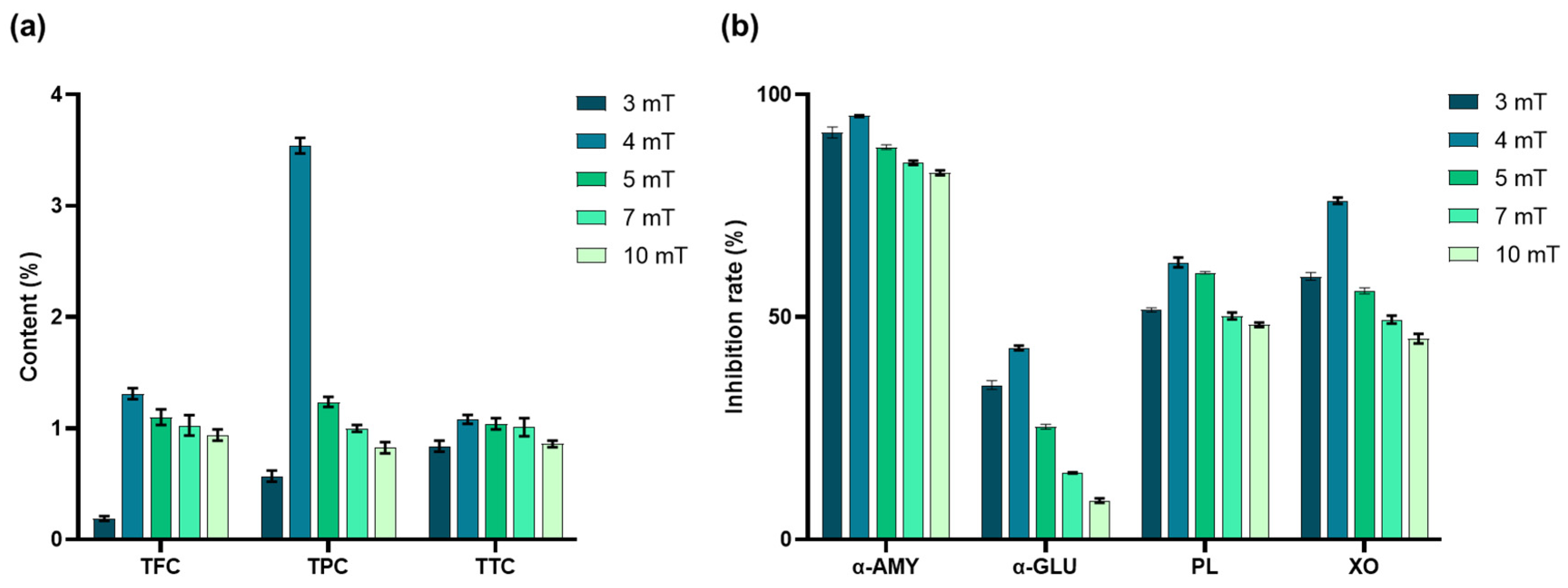APA StyleMa, Q., Lee, S. Y., Liu, Z., Zhang, S., Wang, J., Zaman, K. A. U., Bai, H., & Kim, K. H. (2026). Magnetic Field-Driven Regulation of Bioactive Metabolites and Metabolic Enzyme Inhibition in Sanghuangporus vaninii. Antioxidants, 15(4), 406. https://doi.org/10.3390/antiox15040406