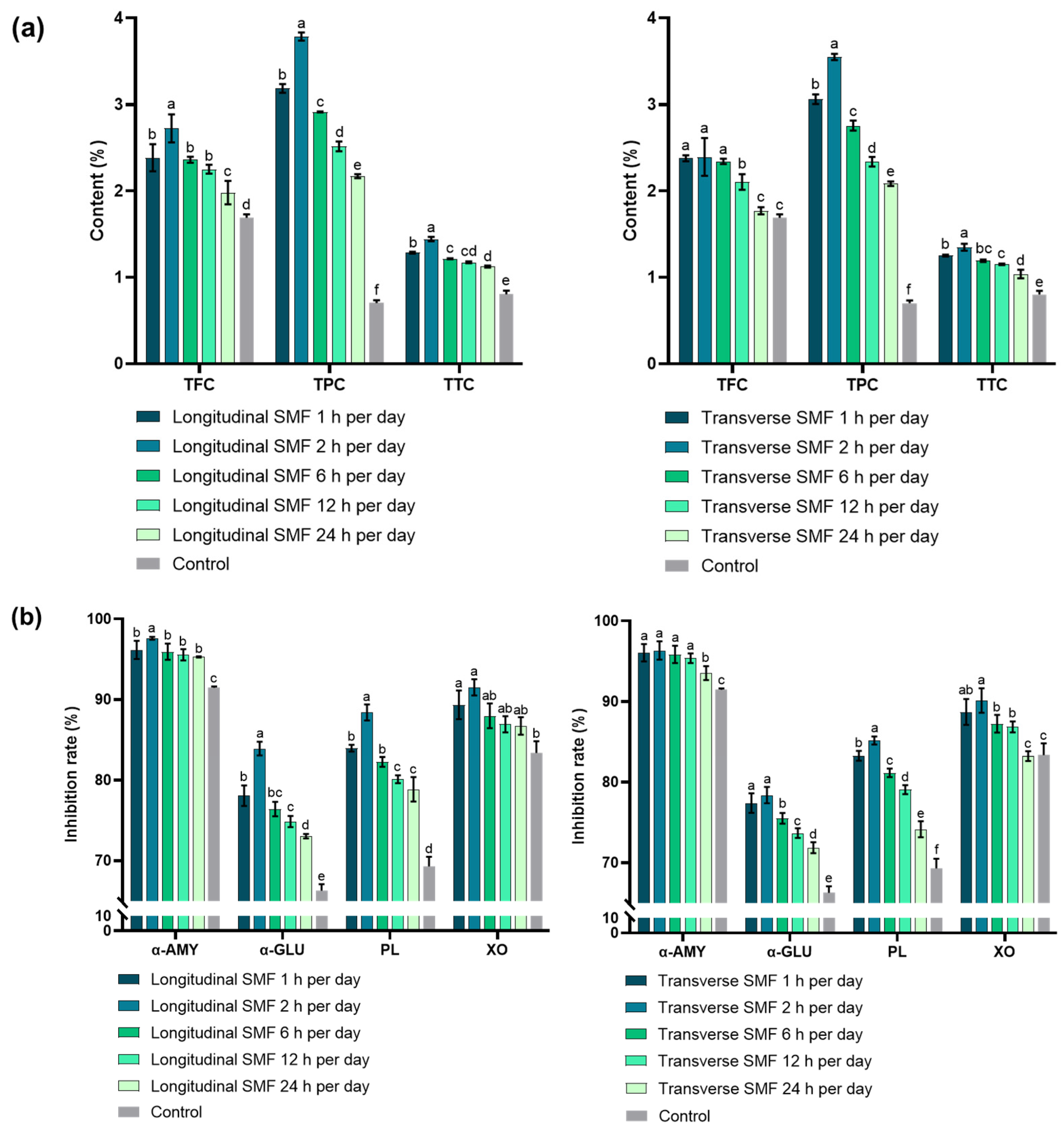 3.5. Influence of SMF Exposure Time on Metabolite Content and Enzyme Inhibition