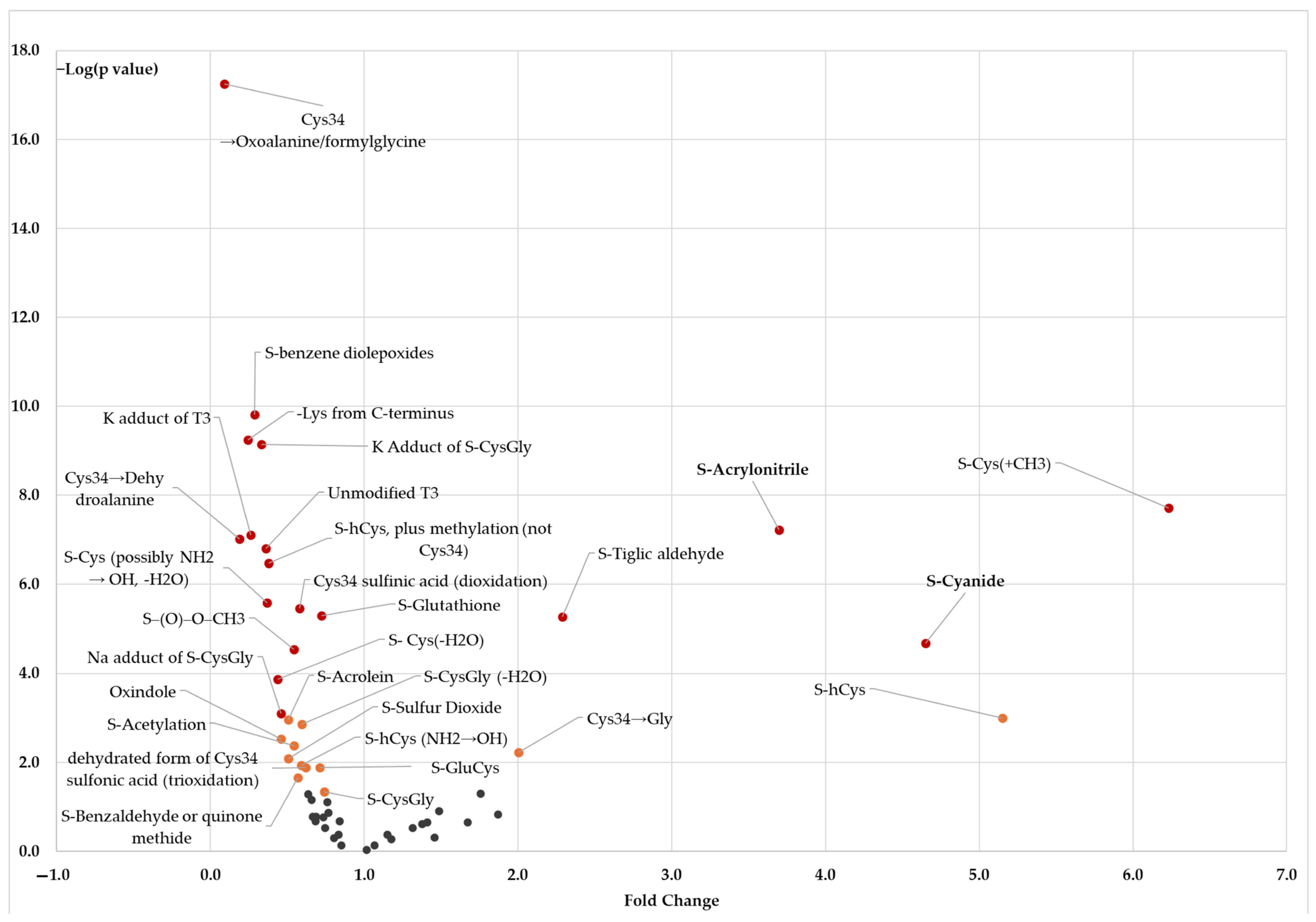 13]. Our panel included adducts of toxicants found in tobacco smoke (acrylonitrile and ethylene oxide), direct oxidation products (e.g., S-sulfinic acid and S-sulfonic acid) that are directly formed through reactions with reactive oxygen species (ROS), reactive aldehydes (e.g., acrolein, crotonaldehyde) generated when ROS interact with polyunsaturated fatty acids, and small thiol compounds (e.g., Cys, GSH, γ-GluCys, and CysGly) that can serve as biomarkers of antioxidant defense.