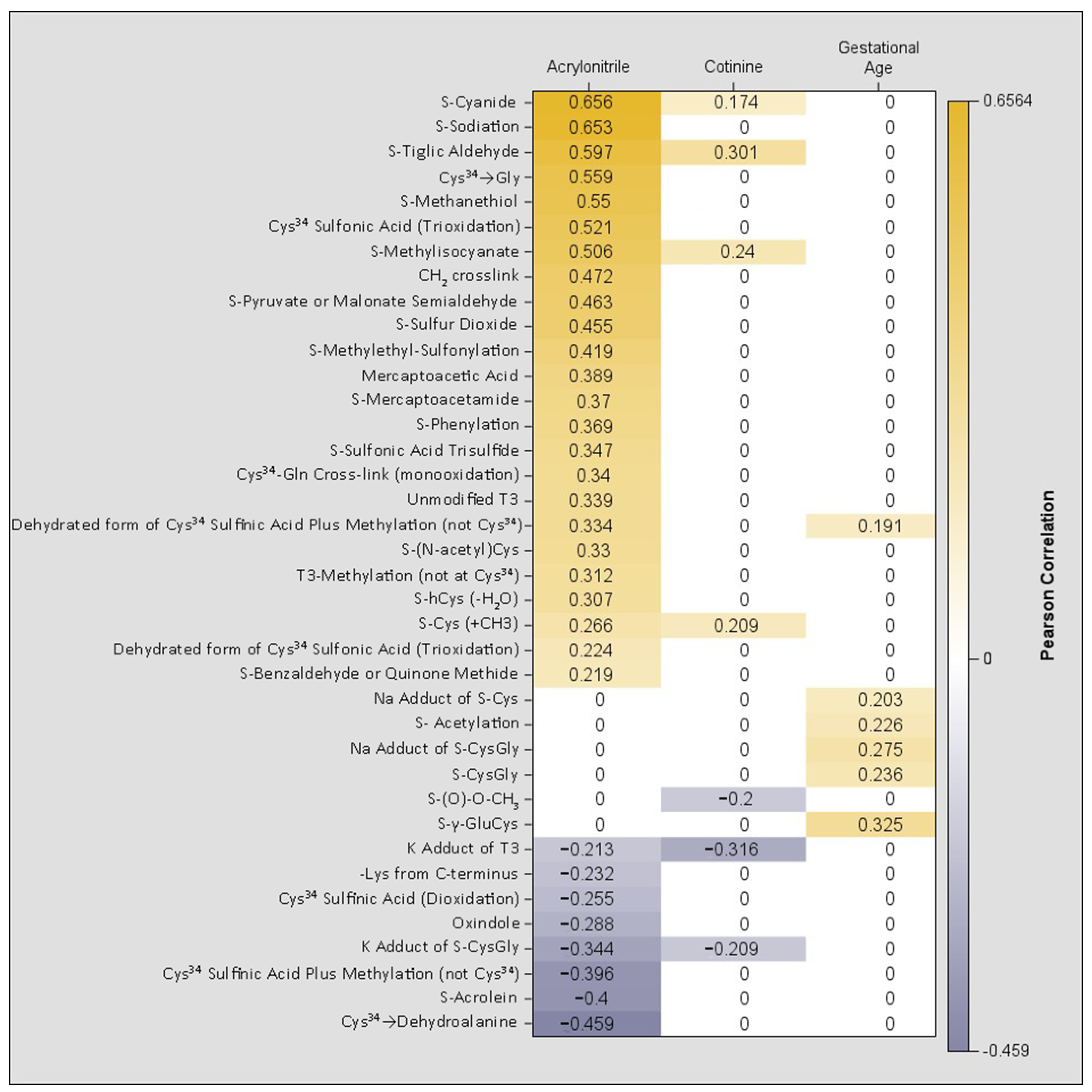 9]. Interestingly, our data further demonstrated that S-Sulfinic acid levels were negatively associated and sulfonic acid and S-(N-acetyl) Cys levels positively associated with acrylonitrile levels, but were not associated with gestational age. In contrast, S-γ-GluCys was not associated with acrylonitrile but was positively associated with gestational age. These findings suggest that alterations in S-Sulfinic acid, sulfonic acid, and S-(N-acetyl) Cys may reflect biological responses to chronic MSDP exposure, whereas changes in S-γ-GluCys may be influenced by other MSDP-related factors, such as preterm birth. Notably, we identified five additional adducts, including S-CysGly and S-acetylation, that were also significantly associated with gestational age. This suggests that these specific adducts may serve as biomarkers for the metabolic maturity of newborns. However, further research is needed to better understand the dynamic relationships among the various Cys