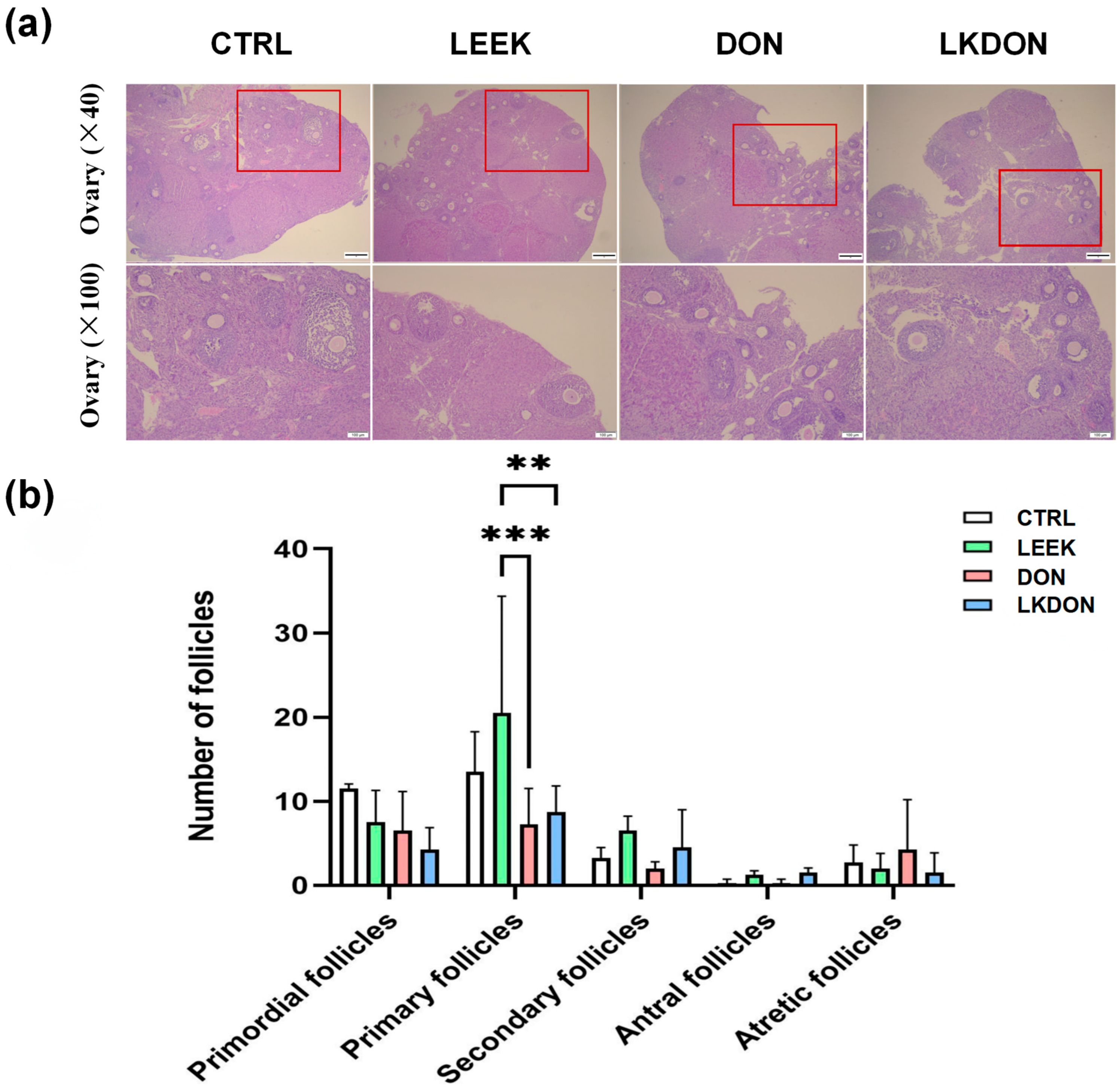 3.1. Effects of DON, LEEK, LKDON on Body Weight Gain and Ovarian Weight in Mice