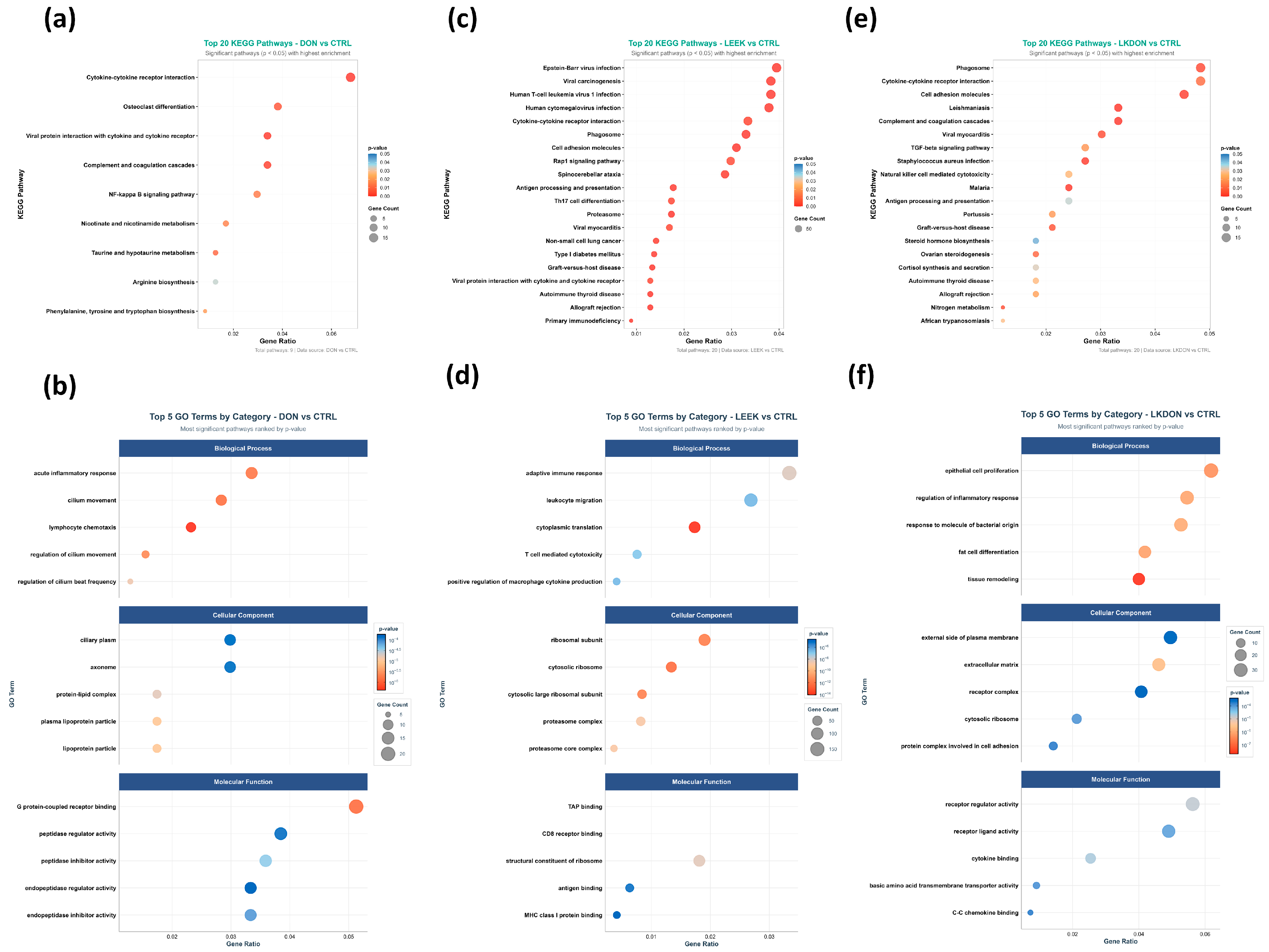 3.5.3. Functional Pathway and Gene Ontology Analysis of Differential Gene Expression in Mouse Ovaries Treated with DON, LEEK, and LKDON