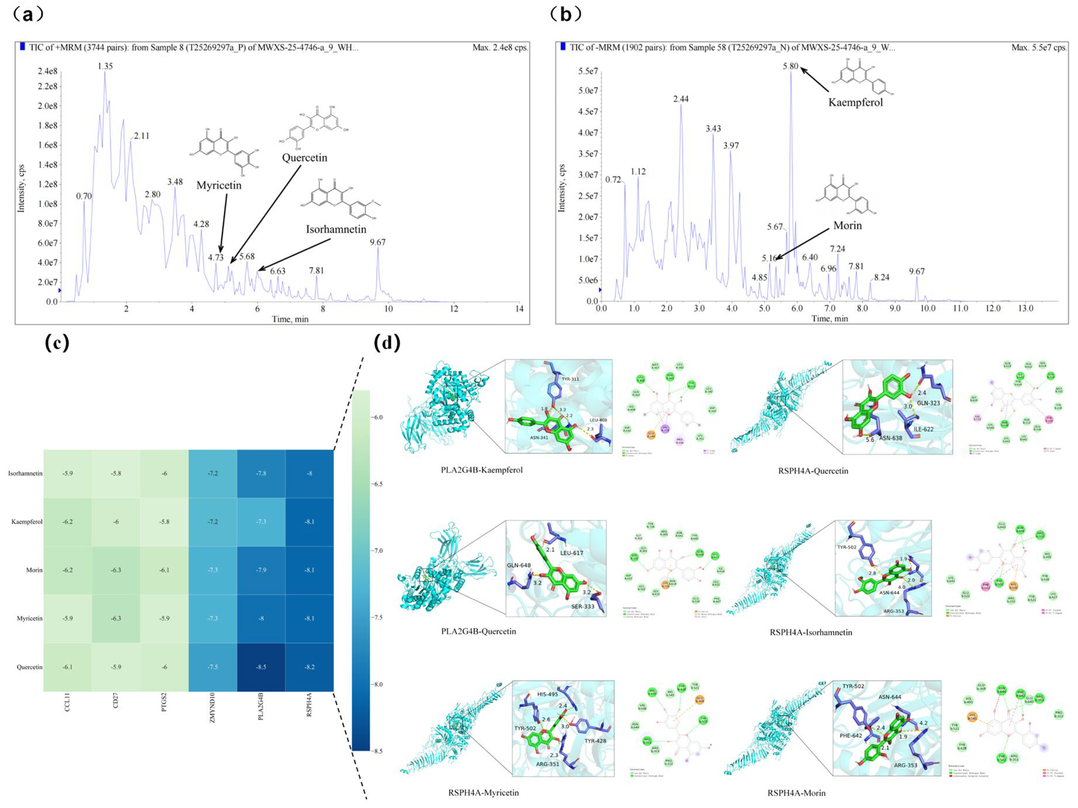 3.6. Chemical Profiling of Fermented Chinese Chive Extract and Molecular Docking with Target Proteins