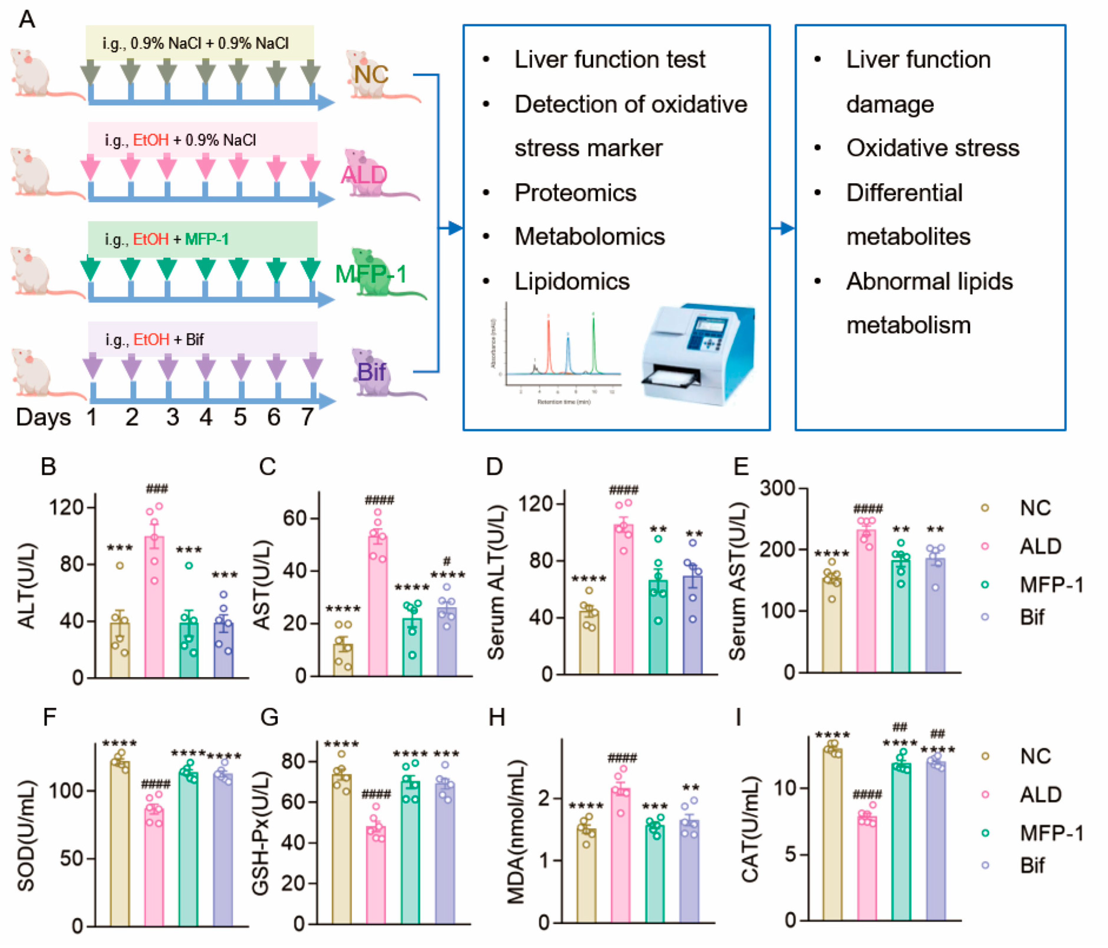 MFP-1 effectively mitigates ALD. (A) The schematic of experimental design. Arrows indicate gavage with 0.9% NaCl, alcohol, bifendate, or MFP-1 every day. i.g., represents intragastric administration; (B–E) The effect of MFP-1 on AST and ALT levels in liver tissue and serum; (F–I) The content or activity of SOD, GSH-Px, MDA, and CAT in the liver tissue. NC for the control group, ALD for the alcohol exposure treatment group, and MFP-1 represents the MFP-1 intervention group. The data are expressed as the mean ± SEM. n = 6. Compared with the ALD group, ** p < 0.01, *** p < 0.001, **** p < 0.0001; compared with the NC group, # p < 0.05, ## p < 0.01, ### p < 0.001, #### p < 0.0001.