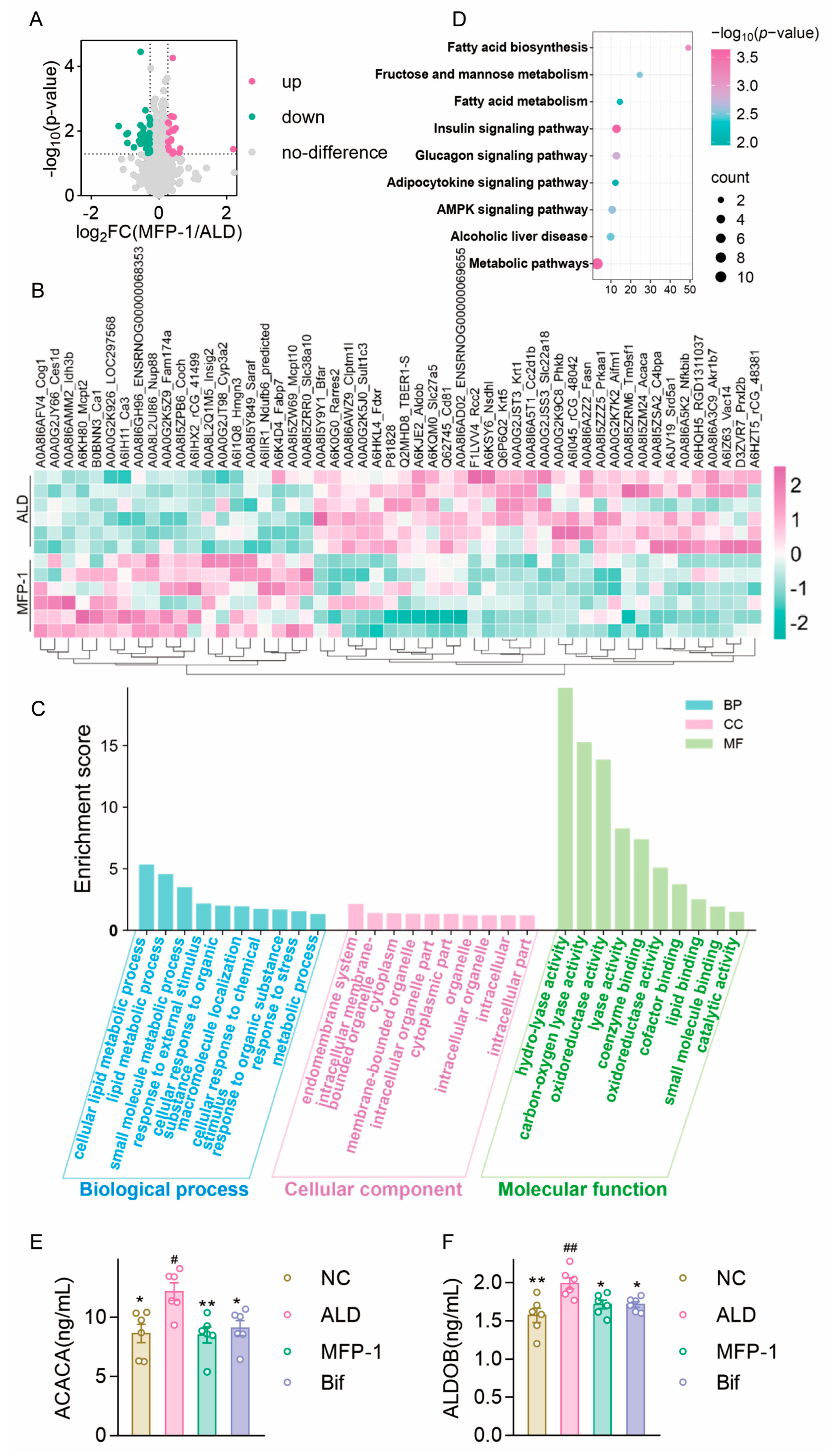 p < 0.05, fold change (FC) >1.2 or <0.263). Among these, 20 proteins were upregulated and 35 proteins were downregulated in the MFP-1 group relative to the ALD group (
