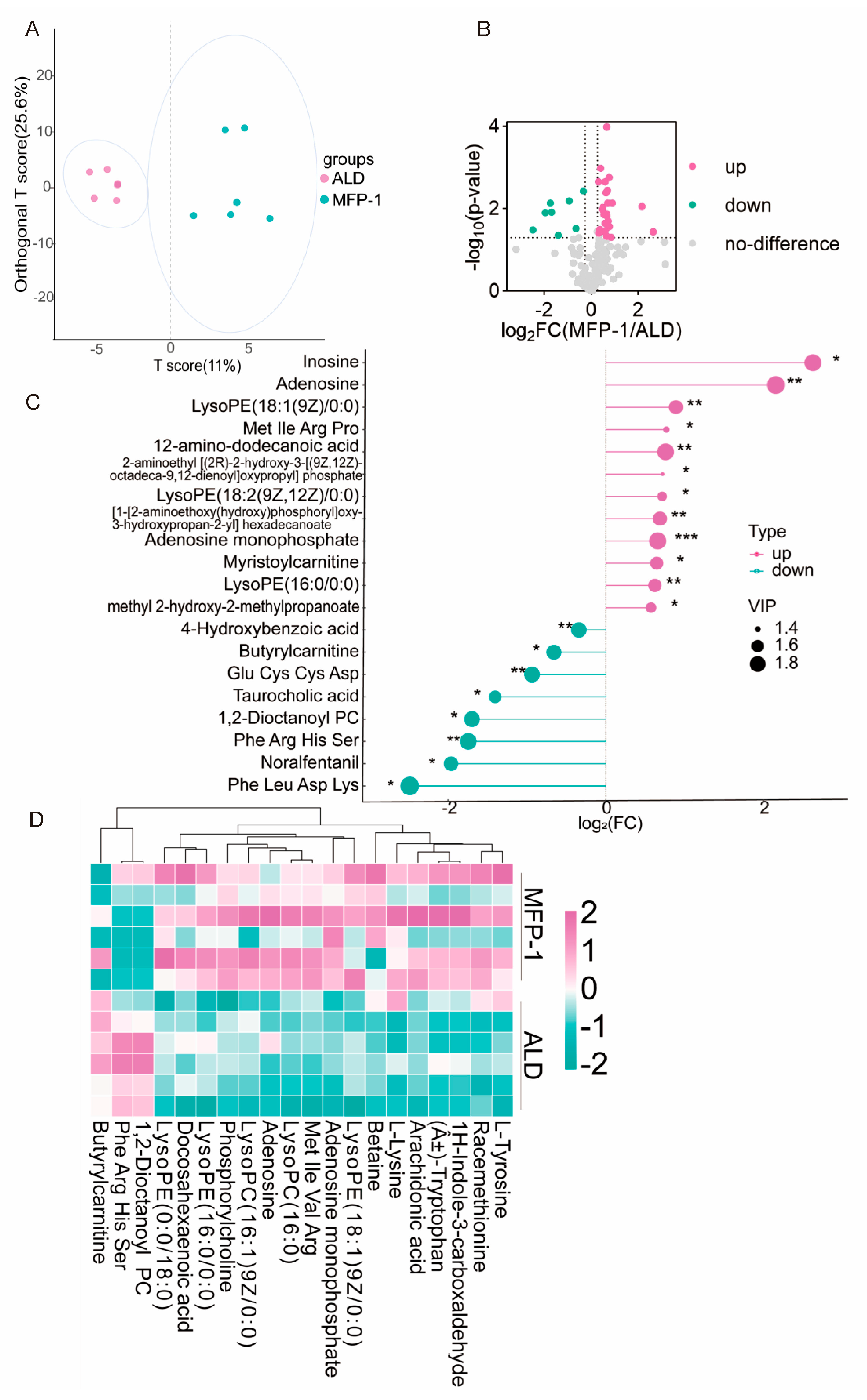 Metabolomics analysis of differential metabolites in blood samples between the MFP-1 group and the ALD group. (A) OPLS-DA analysis map of the MFP-1 group and ALD group; (B) volcano map of the ALD group and MFP-1 group; (C) matchstick map of the ALD group and MFP-1 group. VIP (variable importance in projection) scores indicate the contribution of metabolites to group separation. * p < 0.05, ** p < 0.01, *** p < 0.001; (D) Hierarchical clustering heat map of the ALD group and MFP-1 group (green down, pink up). n = 6.