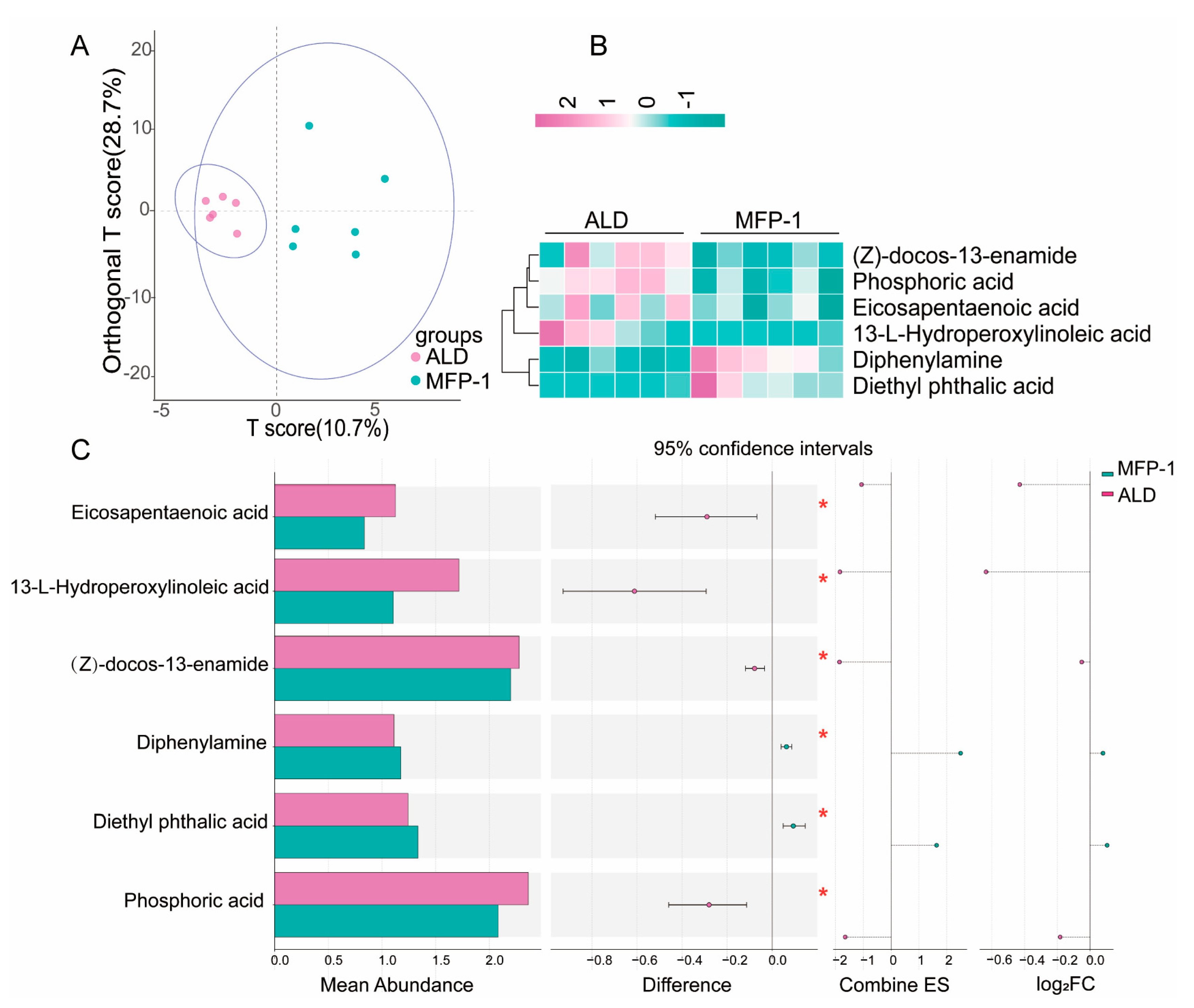 Metabolomics analysis of differential metabolites in liver tissues between the MFP-1 group and the ALD group. (A) OPLS-DA analysis map of the MFP-1 group and ALD group; (B) Hierarchical clustering heat map of ALD group and MFP-1 group (green down, pink up); (C) Abundance profile of major differential metabolites of ALD group and MFP-1 group,* p < 0.05. n = 6.