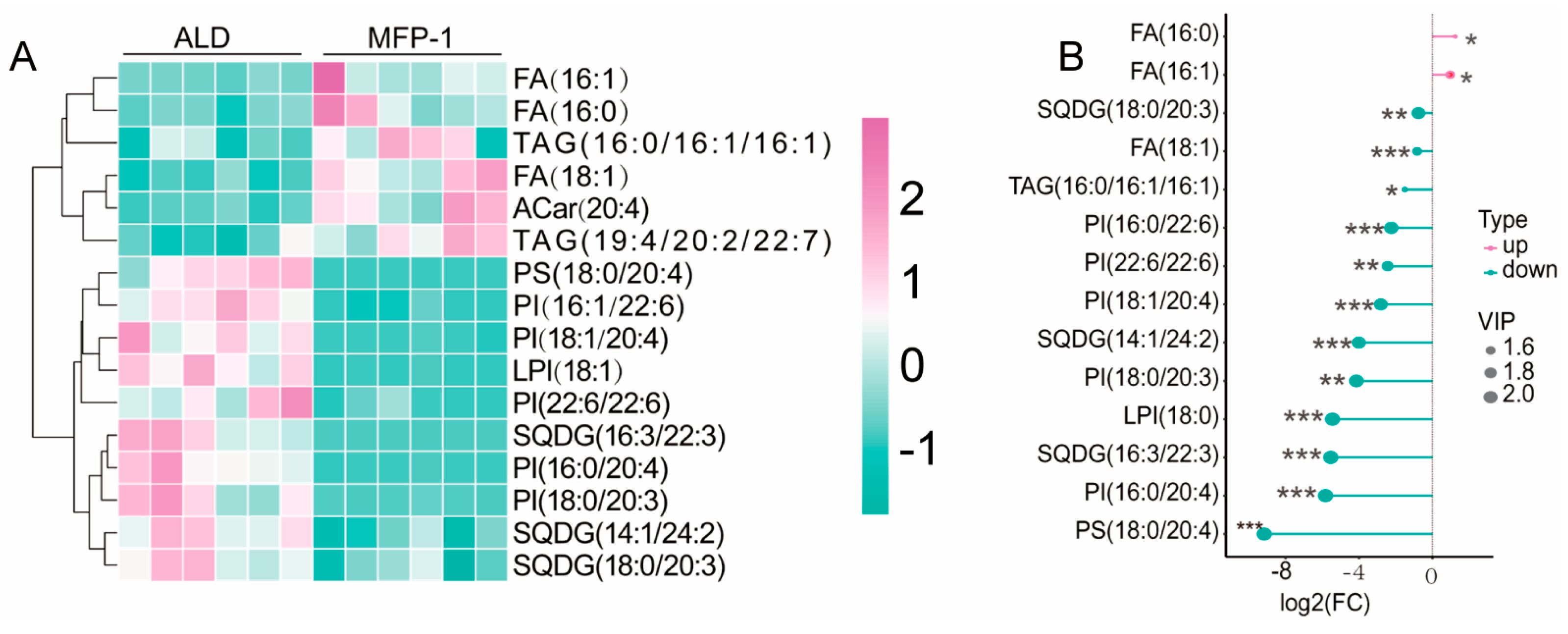 Lipidomics analysis of differential metabolic lipids in livers between the MFP-1 group and ALD group. (A) Hierarchical clustering heatmap of differential lipid biomarkers in the ALD and MFP-1 groups. pink is up-regulated, green is down-regulated; (B) matchstick map of the ALD group and MFP-1 group. VIP (Variable importance in projection) scores reflect the contribution of lipids to group separation. * p < 0.05, ** p < 0.01, *** p < 0.001 (n = 6 per group).