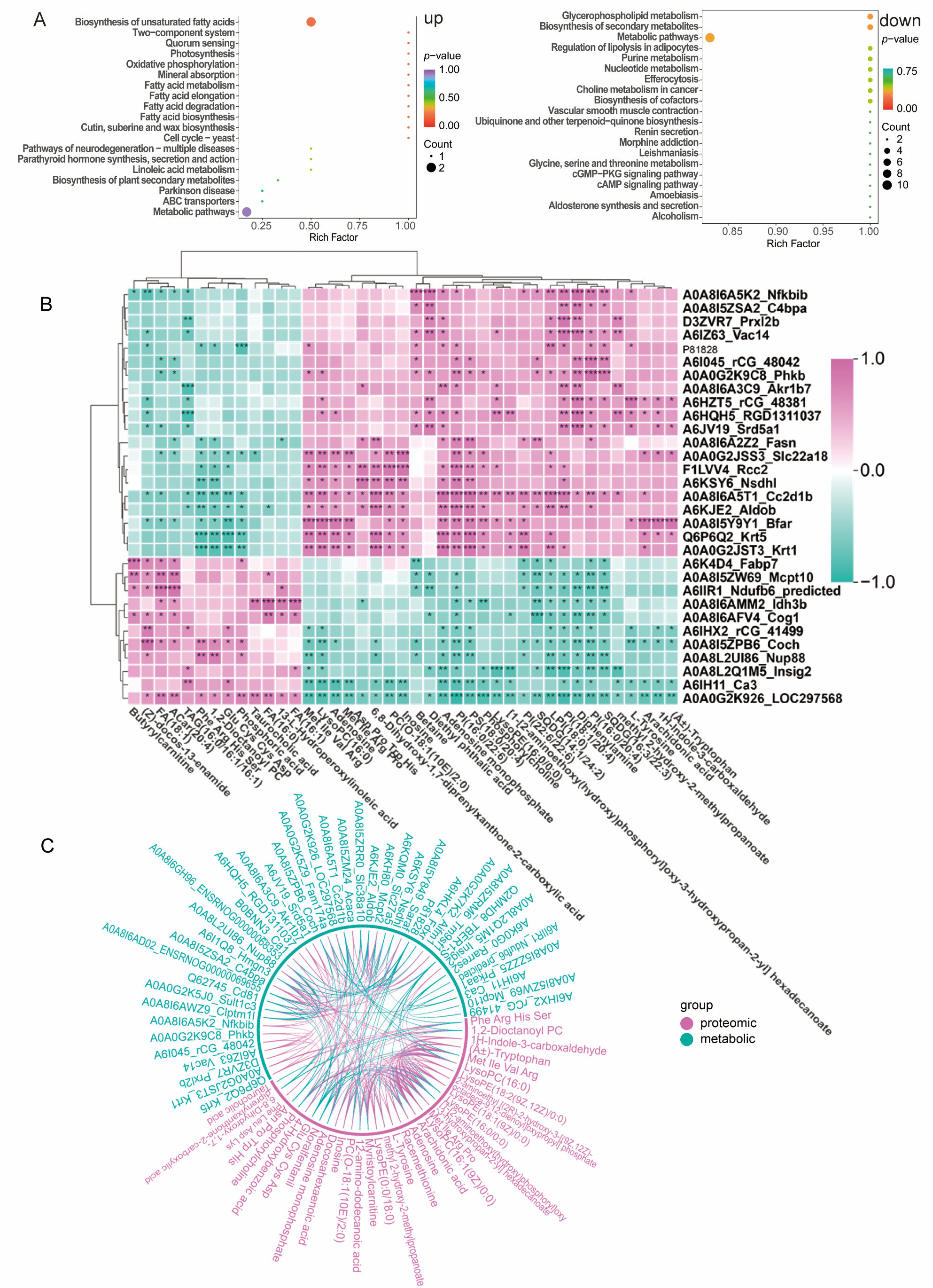 Comprehensive analysis of proteomics, metabolomics, and lipidomics between the MFP-1 group and ALD group. (A) KEGG enrichment analysis of metabolites and metabolic lipids in ALD and MFP-1 groups. Count the number of enriched metabolites; (B) Pearson correlation analysis between proteins, lipids, and metabolites in ALD and MFP-1 groups. Pink is a positive correlation, and green is a negative correlation. n = 6. * p < 0.05, ** p < 0.01, *** p < 0.001; (C) Multi-omics and chord diagrams analysis between proteins, lipids, and metabolites in ALD and MFP-1 groups.
