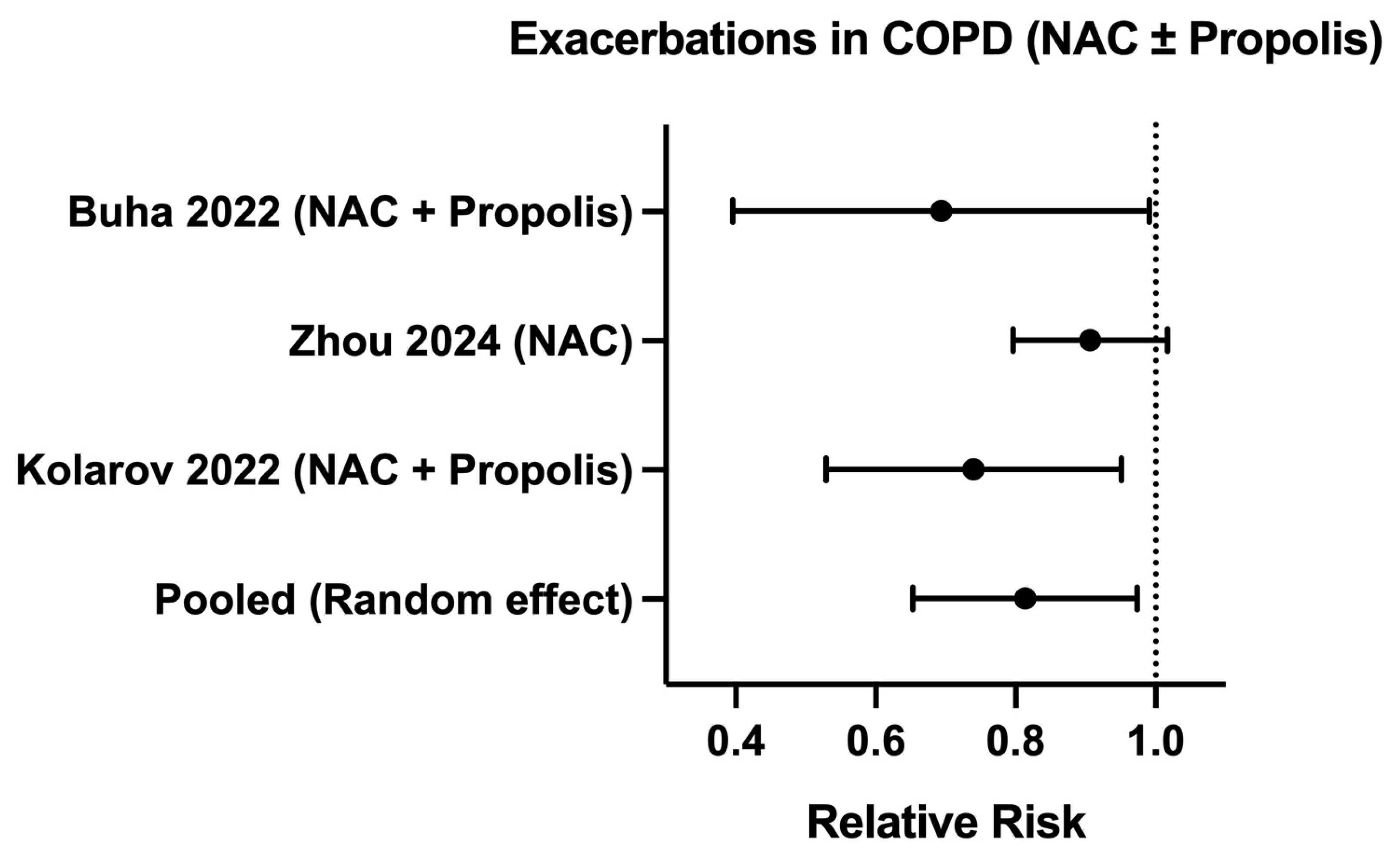 | 1 | Buha I (2022) [11] PMID:35856373 | RCT, DB, PC | NAC + Propolis | Placebo | N = 46; 27/19 | 3 months | Exacerbations | NAC significantly reduced exacerbation frequency. | 11/11 |