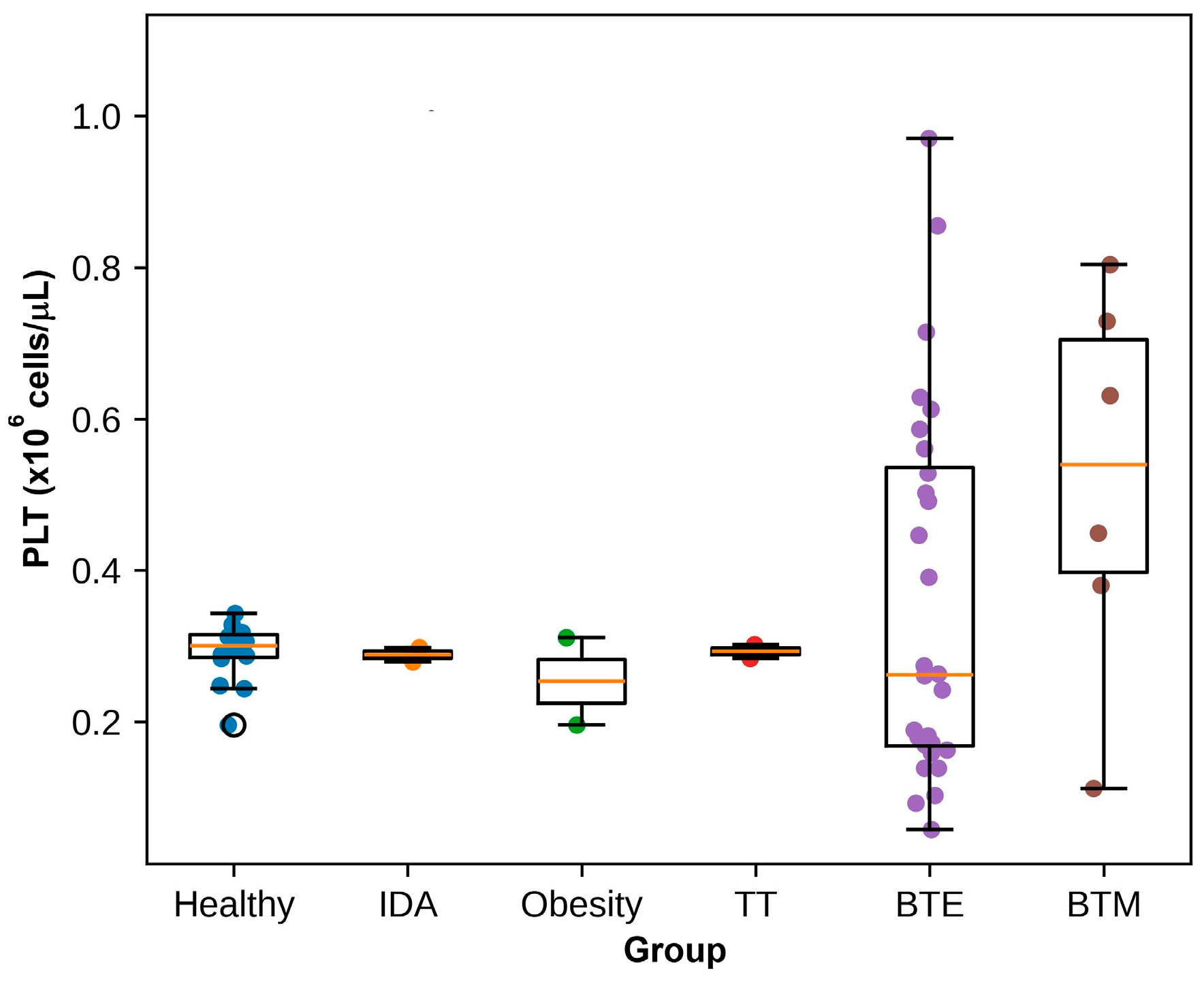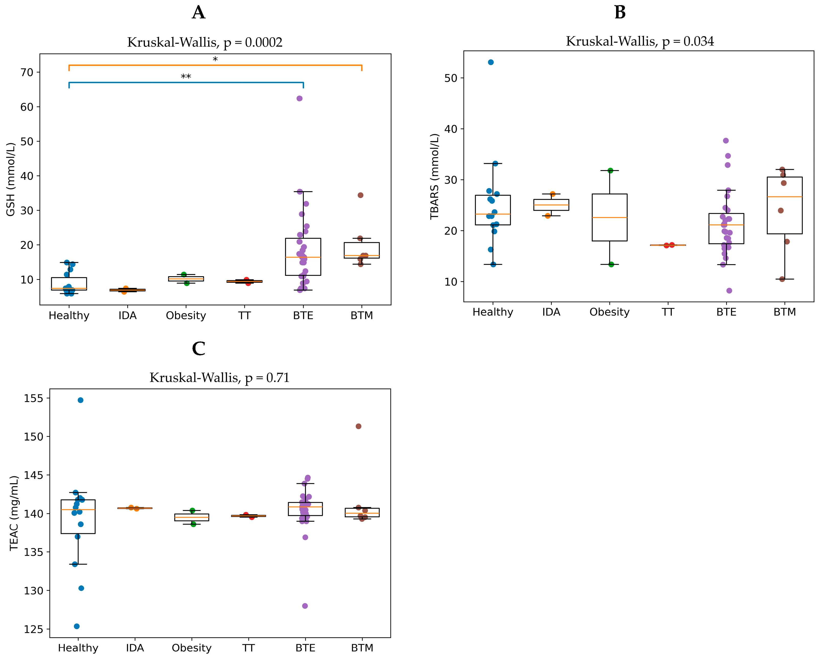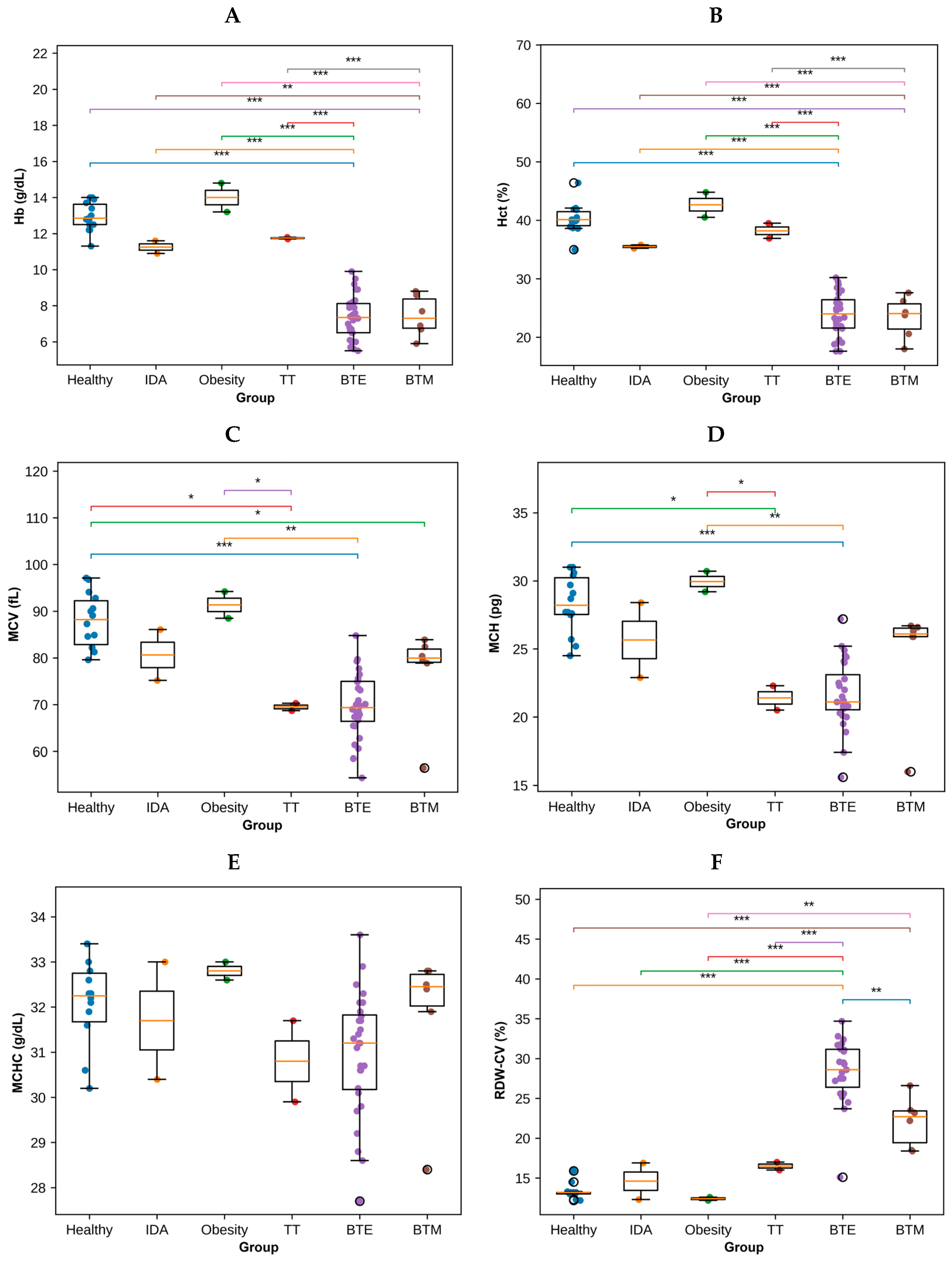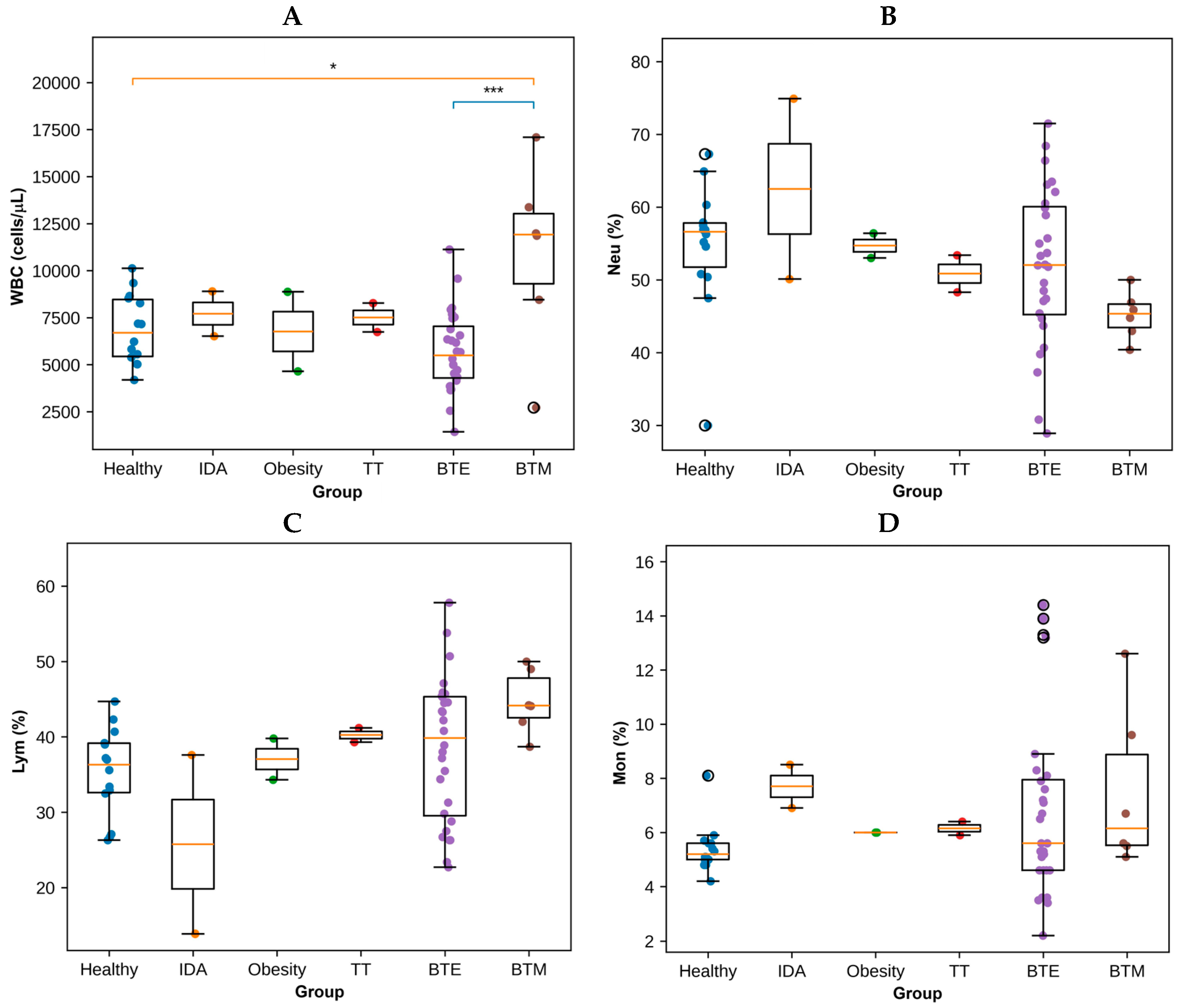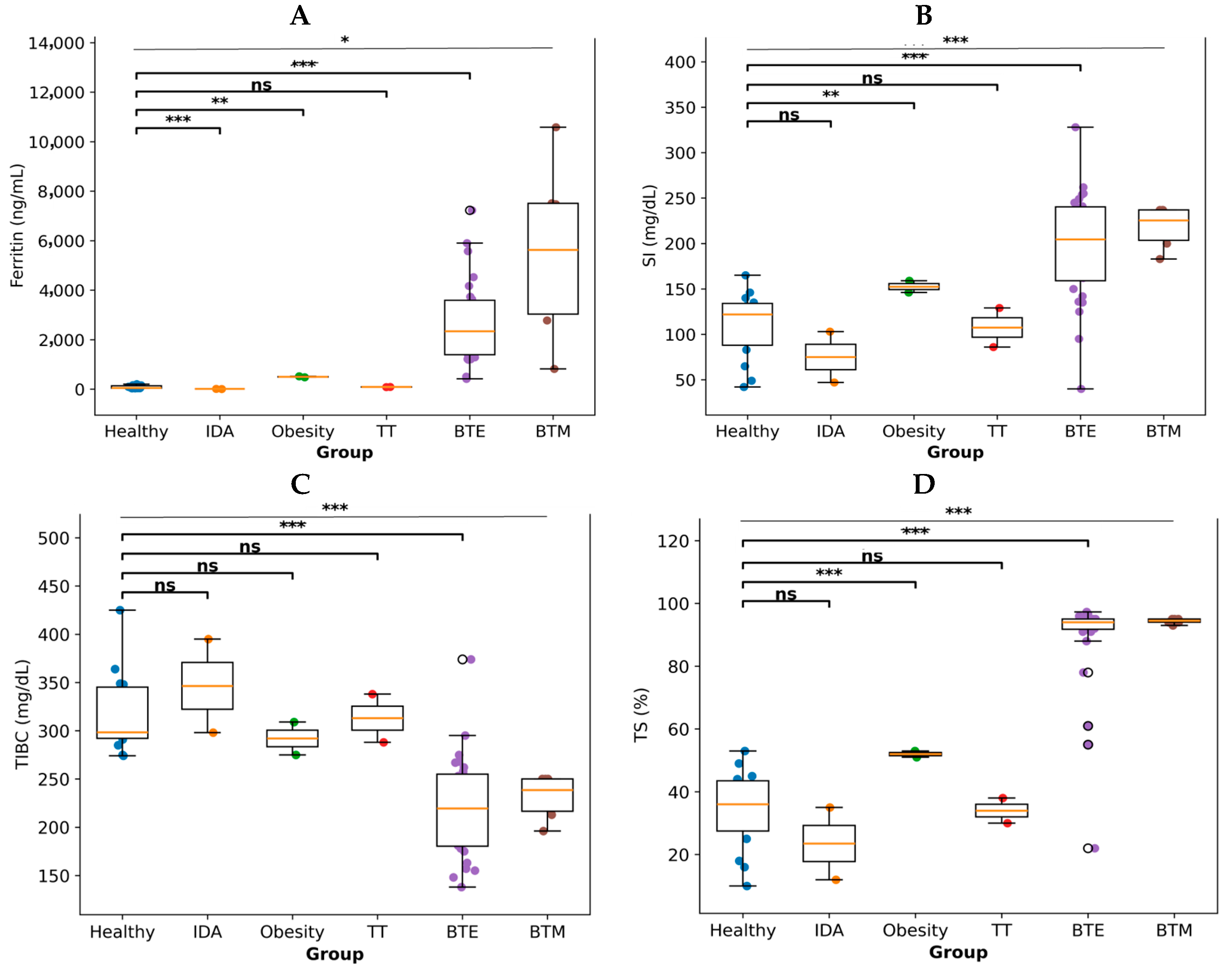 Statistical analysis was conducted using the IBM SPSS Statistics software, version 21.0 (IBM Corp., New York, NY, USA). Demographic characteristics were analyzed using descriptive statistical methods. Data are presented as mean ± standard deviation (SD) values for normally distributed variables or median values with interquartile ranges (IQRs) for non-normally distributed data. The normality of data distribution was assessed using the Shapiro–Wilk test. For hematological parameters, differences among the six study groups (healthy controls, IDA, obesity, TT, BTE, and BTM) were analyzed using one-way analysis of variance (ANOVA) followed by Tukey’s multiple comparison test when appropriate. For serum biochemical parameters, comparisons between each clinical group and the healthy controls were performed using an independent two-sample