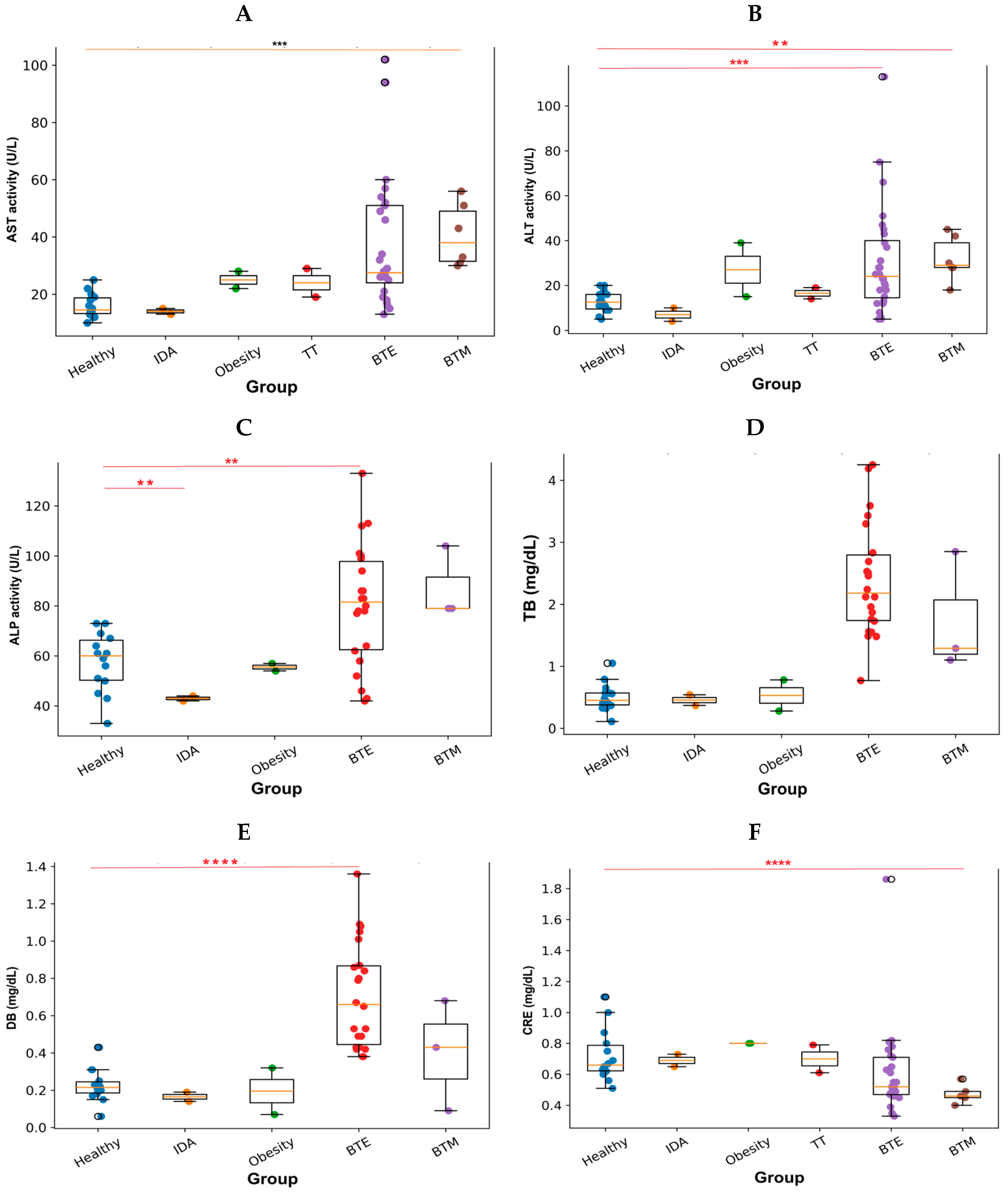 28]. This study revealed elevated liver enzyme activities and bilirubin levels in thalassemia patients, particularly in the BTE and BTM groups. The increased AST, ALT, and ALP levels suggest hepatic stress or damage, which may have resulted from chronic hemolysis, repeated BTX, and iron accumulation in the liver. Elevated bilirubin levels further support increased erythrocyte destruction, a hallmark of thalassemia pathophysiology [